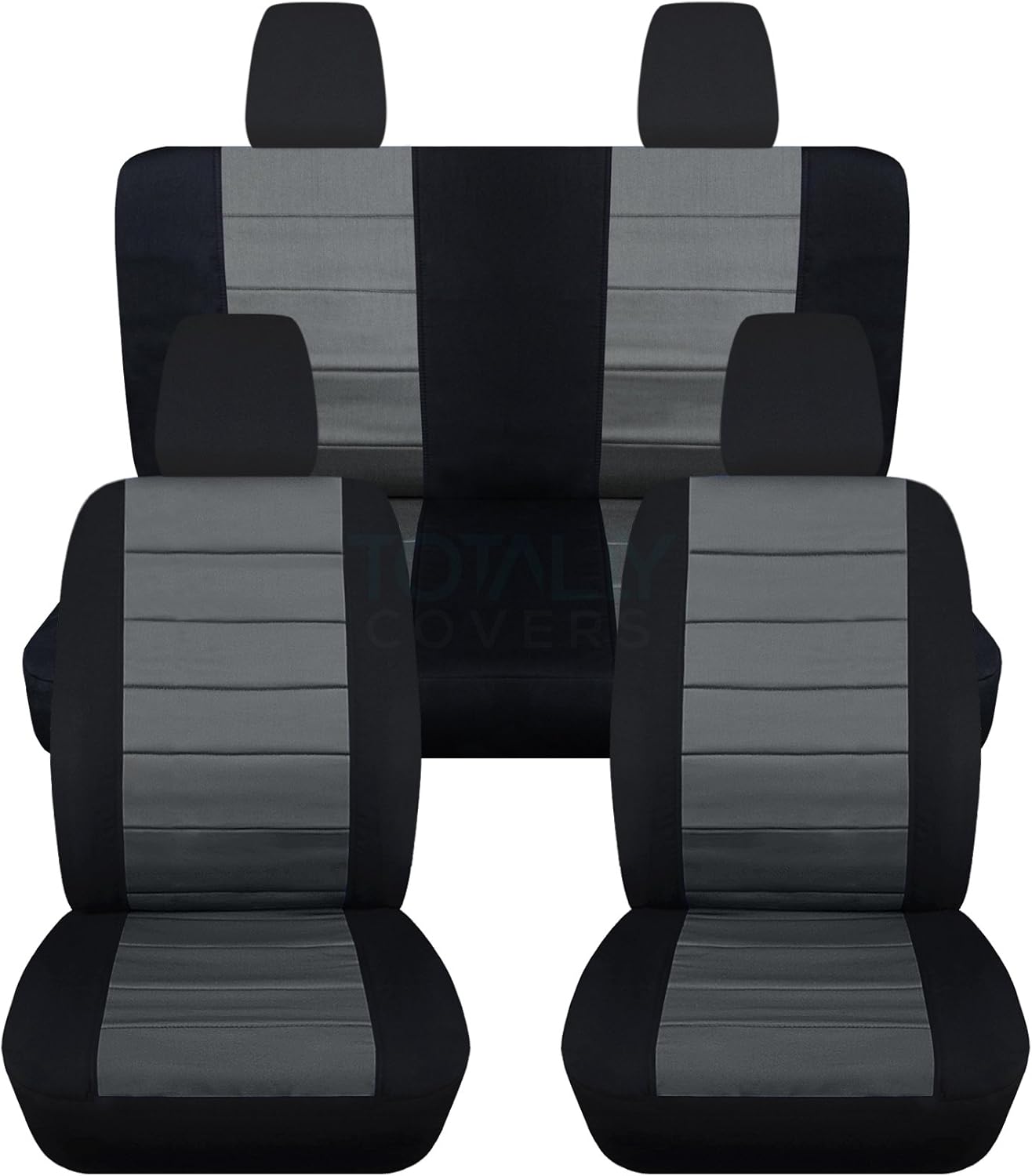 A full set of front and rear, black and burgundy seat covers for a 2008 to 2009 Jeep Liberty and Dodge Nitro. Be sure to visit our storefront ("Totally Covers") where you can find the largest selection of seat covers, to satisfy even the most demanding of tastes. If you can't find what you are looking for, please contact us ("Totally Covers") We can make seat covers for ANY car, truck, van, RV or SUV in a variety of 145 colors and prints, and even add your name/text and logo/design on them!