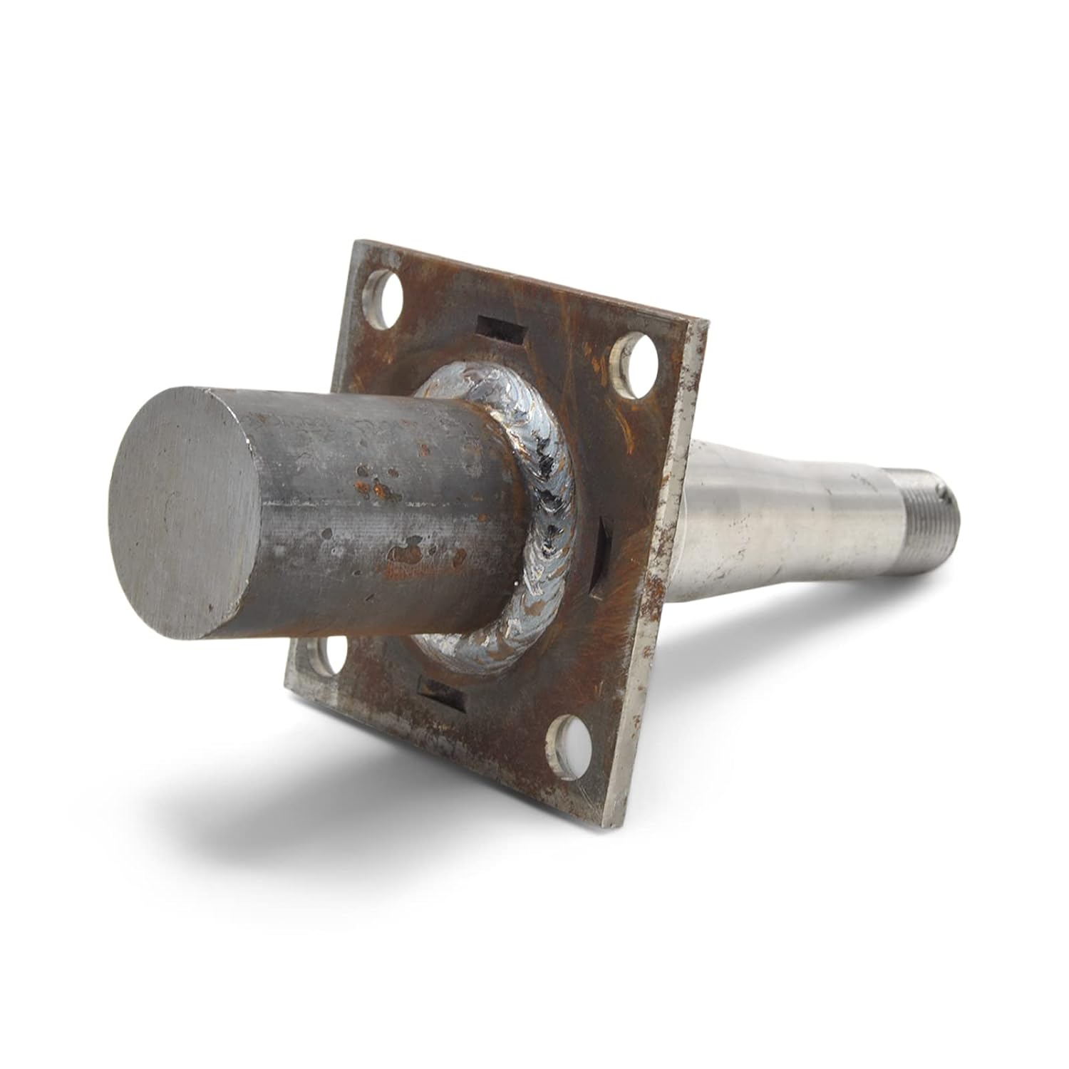 This weld-on 3500 lb steel trailer axle spindle is sized to fit #84 bearing combination hubs and includes a 1 3/4" diameter round weld-on butt end. The steel spindle is designed to weld into axle tubing and replace a damaged or unusable spindle, or to build a straight trailer axle from scratch. This spindle accommodates a 1 1/16 inch outer bearing, 1 3/8 inch inner bearing, and has a 1.72-inch inner diameter seal surface. The spindle comes with an EZ Lube grease fitting installed, so you can simply attach a grease gun to the zerk and relubricate your hubs bearings without disassembling the hub. The attached brake flange is sized to fit standard 3,500 lb 5 lug axle disc brake kits, such as those manufactured by Deemaxx, Kodiak, or Tie Down Engineering; or 10-inch drum brake backing plates.If you need an accompanying hub for this spindle, you would need our Galvanized 3,500 lb Hub Kit, while if you plan to reuse your existing hubs you will just need a 3,500 lb Bearing Kit. This is a great product for repairing a broken spindle on an otherwise good axle or for building an axle from scratch if you have the experience to make these repairs or fabrications. This spindle is drilled for use with a Cotter Pinsand 1" Round Flat Washer.