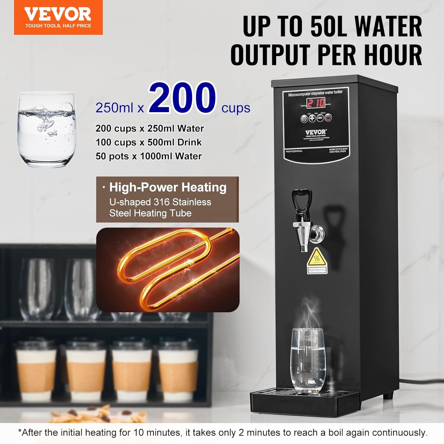 • Efficient Water Output: The VEVOR 15L Commercial Water Boiler features a 316 stainless steel U-shaped heating element, which doubles the heating efficiency. With its powerful 1500W heating, it delivers up to 50L of hot water per hour, providing a steady flow of water. You can serve up to 200 cups of 250ml water per hour without interruptions, making it perfect for high-traffic times. Plus, it’s free of heavy metals, ensuring secure drinking water.