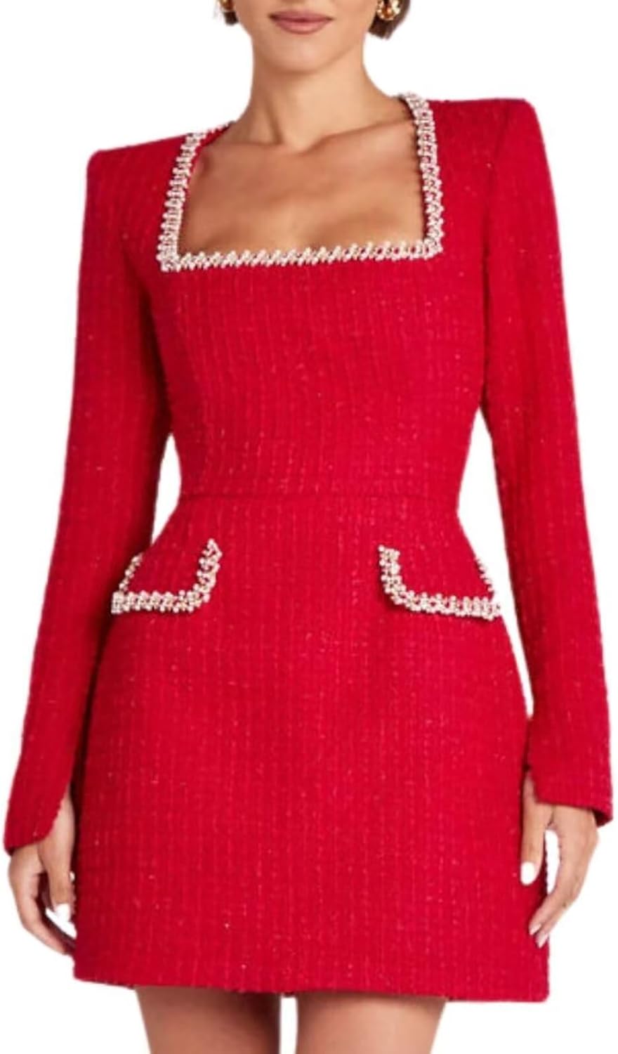 Kotiera Women's Tweed Mini Dress Elegant Beaded Square Neck Long Sleeve High Waist A-Line Party Club Bodycon Short Dresses