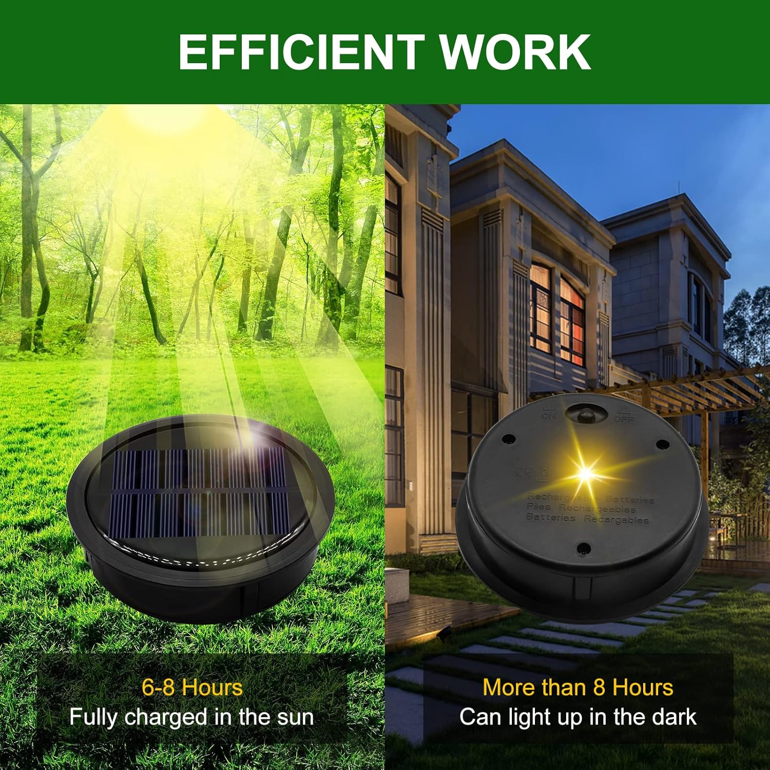 These replacement solar tops light are perfect. Saves your money because you no longer have to throw away your whole old solar lights. Also our solar tops light include the rechargeable solar battery, longer service life, more energy saving and environmental protection. Why not buy now? HOW TO USE 1.Push the OFF switch to ON. (This light has a light sensor, it will light up at dusk automatically.) 2.Charge it more than 8h by solar energy. SPECIFICATIONS Solar panel: Polysilicon 50% efficiency UP NI-MH AA Battery: 1200 mAh / 3.7 V LED: 1 brighter LED Light Color: Warm White Material: Plastic Charging time: 8 hours Working time: Light up more than 10h in summer and 8h in winter after fully charge.