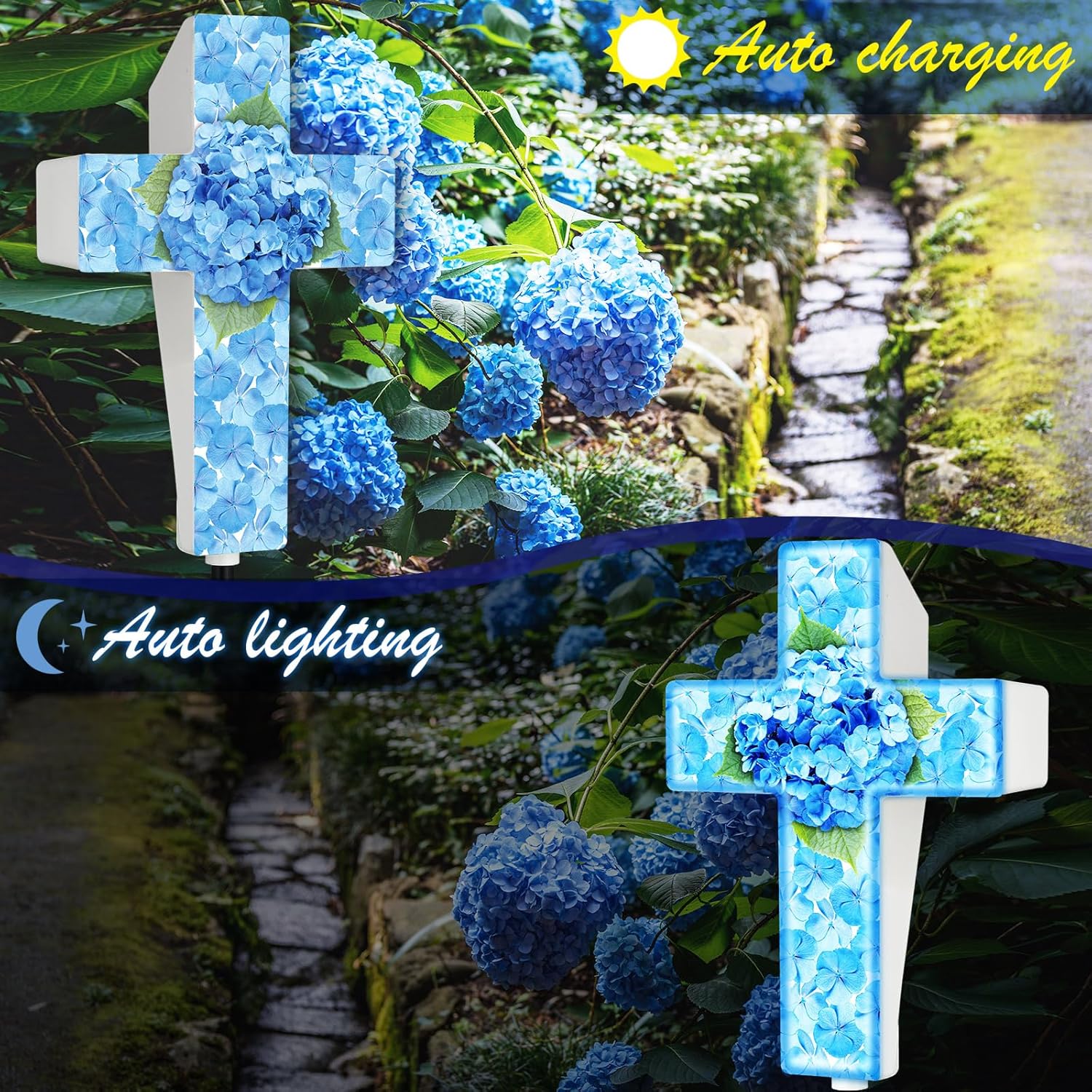 Features: The package includes 1 solar cemetery cross, offered with all the features you require for making an elegant statement in your outdoor space. You don't need other things to remember your loved ones in a graceful style and with lingering warmth, making this garden stake cross an ideal part of your memorials or decorations. Our garden stake cross has the impressive feature of automatic lighting. As soon as night falls, the cross gleams with a warm, comforting light, creating a nice spectacle in your garden or at the roadside memorial. This not only enhances visibility but also adds a mystical aura to the cross, touching the chord of divine connection. Specifications: Material: plastic Color: blueSize: about 14.17 x 9.84 inches/ 36 x 25 cmPackage includes: 1 x Memorial solar stake crossNotes: Manual measurement, please allow slight errors on size. The color may exist a slight difference due to different screen displays. Pointed items are included, please keep away from little kids.