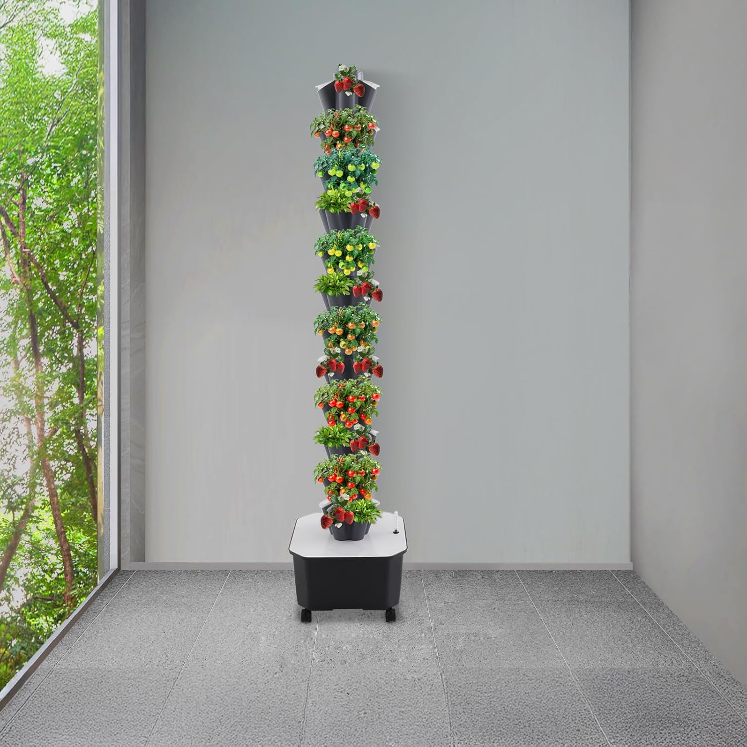 ApplicationIt is suitable for homes, commercial spaces, botanical gardens, hydroponic mechanisms, etc. It can be used to grow strawberries, lettuce, peppers, vegetables, fruits, flowers, and more.SpecificationColor: Black, GreyMaterial: PPProcess: Injection MoldingStyle: ModernShape: TowerAssembly Required: YesMount Type: FreestandingNumber of Universal Wheels: 4(All with brakes)Number of Tiers: 12Number of Holes: 60Power Supply: Corded ElectricPower Adapter: Plug Type: US StandardInput: 100-240V AC 50/60HzOutput: 12V 2AWater Pump: Input Voltage: DC 12VQmax: 1000L/264.17Gal/HHmax: 3.3M/10.83FTPower: 10WProtection Grade: IPX8Water Tank Capacity: 25L/6.6Gal Water Tank Size: 40*40*20cm/15.74*15.74*7.87inTotal Height: 184cm/72.44inPackage Size: 47*42*42cm/18.5*16.54*16.54inGross Weight: 6.4kg/14.11lbsNet Weight: 6.08kg/13.4lbsPackage Included1* Hydroponic Grow Tower1* Water Level Gauge1* Power Adapter1* Water Pump1* Chinese&English Manual4* Universal WheelsOther Accessories for AssemblyNotes 1. Please check the style and size before purchasing.2. Please read the instruction manual completely before installation and use, and pay particular attention to the safety instructions included.3. Please note that this product does not contain virgin fruit, lettuce, eggplant, strawberries, peppers, or cucumbers.