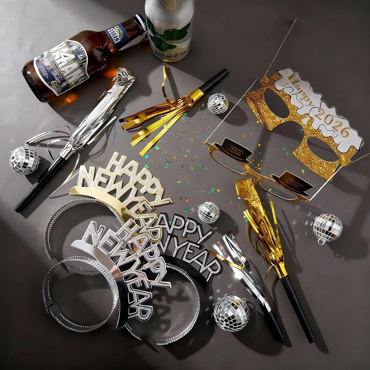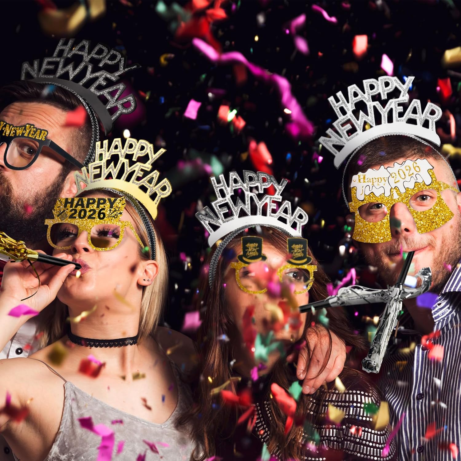 Features: Give the gift of cheer with our New Year party favors 2026. With 48 sets included, there's enough to gift to partners and family or even party guests. Each set is practical and attractive, suitable for those casual celebrations. Despite the bulk, our New Year's Eve party accessories are lightweight and easy to carry. They can be conveniently packed and transported to many celebration venues. With these lightweight party supplies, you're always ready to welcome the New Year when you are. Specifications: Material: Headband: paper Glasses: paper Noise makers: plastic, tassel Package includes: 48 x Happy New Year headbands 48 x New Year glasses 24 x Long fringed noise makers 24 x Short fringed noise makers Notes: Manual measurement, please allow slight errors on size. The color may exist a slight difference due to different screen displays