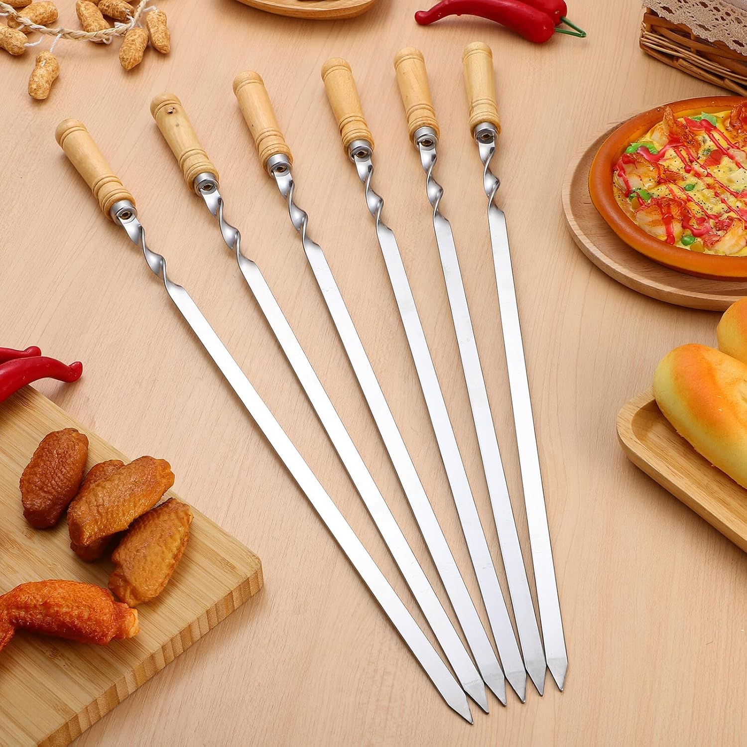 Package List 18 x Barbecue Skewers Features -Material:410 Stainless Steel shrimp skewers -Size:55.00X2.00X2.00cm/21.61X0.79X0.79in barbeque skewers -Product Info:BBQ flat sign -Color:Silver meat skewer The head has been sharpened, which is convenient for piercing meat. With enough quantity, this BBQ skewer can meet the needs of one barbecue roasting sticks. This barbecue skewer uses flat design, which can make the roast more stable, less prone to tipping, and easier to flip skewers for BBQ. This barbecue skewer can be used on many different occasions, such as grilling, kitchen, outdoor dining, picnic, etc flat barbecue skewers. With wooden handle design, this barbecue skewer is anti-skid and anti-scald for you to hold comfortably BBQ kebob sticks. Made of stainless steel material, this barbecue skewer has heat resistance, can be reused and can be easily cleaned kabob skewer with wood handle.Goods InformationBBQ kebob sticks With the help of it, you can get your delicious kabobs grilled quickly and safely.kebob skewer with wood handle And it is suitable for meat, shrimp, chicken, vegetable, etc.bbq barbeque skewers This is a stainless steel BBQ barbecue skewer.flat skewer Do you like barbecue? If yes, this product must be the right option for you.kabob skewers grilling It is lengthened and thickened, which is more convenient and can be used for a long time