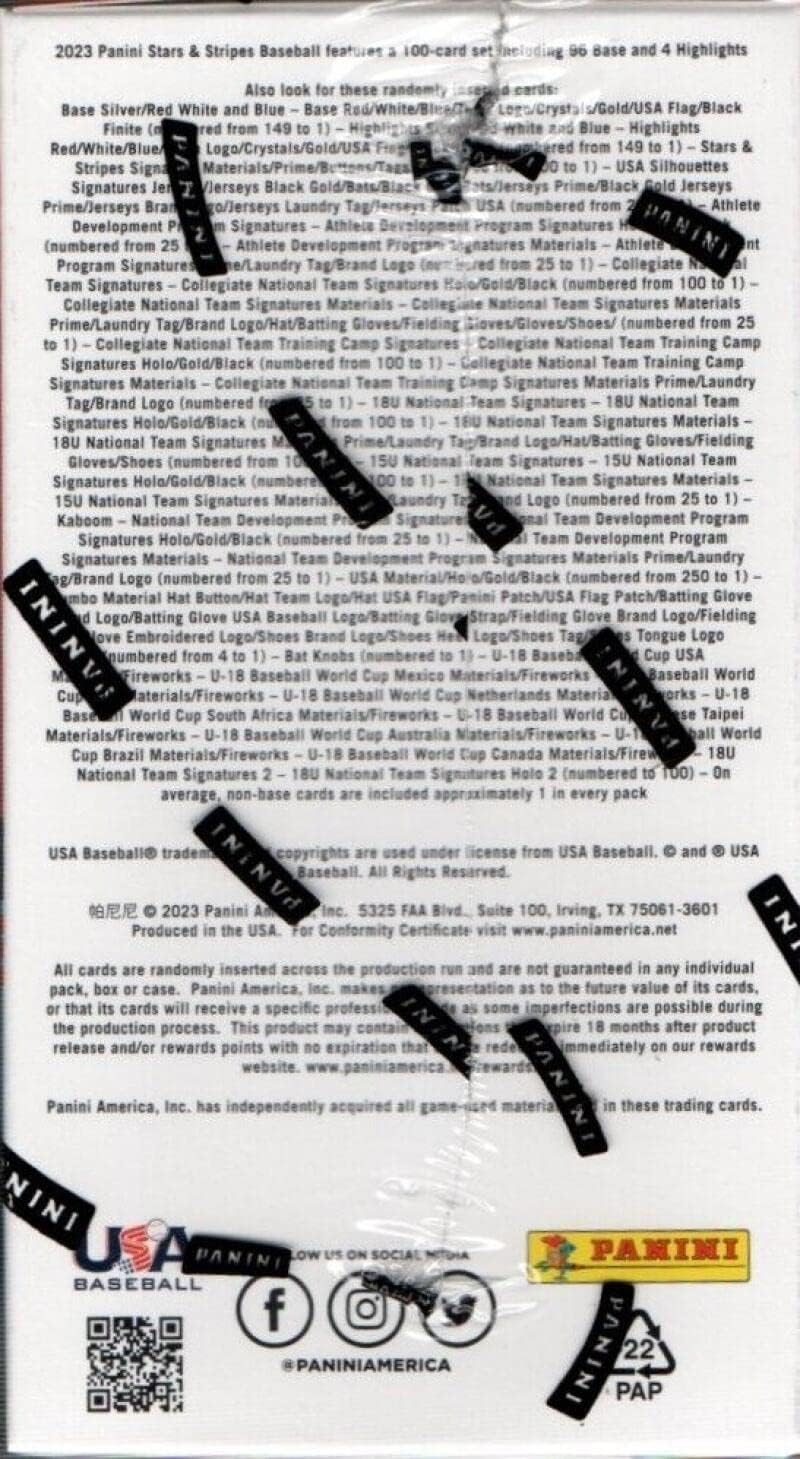 2023 Panini USA Baseball Stars and Stripes Factory Sealed Blaster Box 2 Auto or Memorabilia Per Box! 35 Cards 7 Packs of 5 Cards. 35 Cards in all! Look for exclusive Red White and Blue Parallels! Blasters are my personal favorite to open for great value!