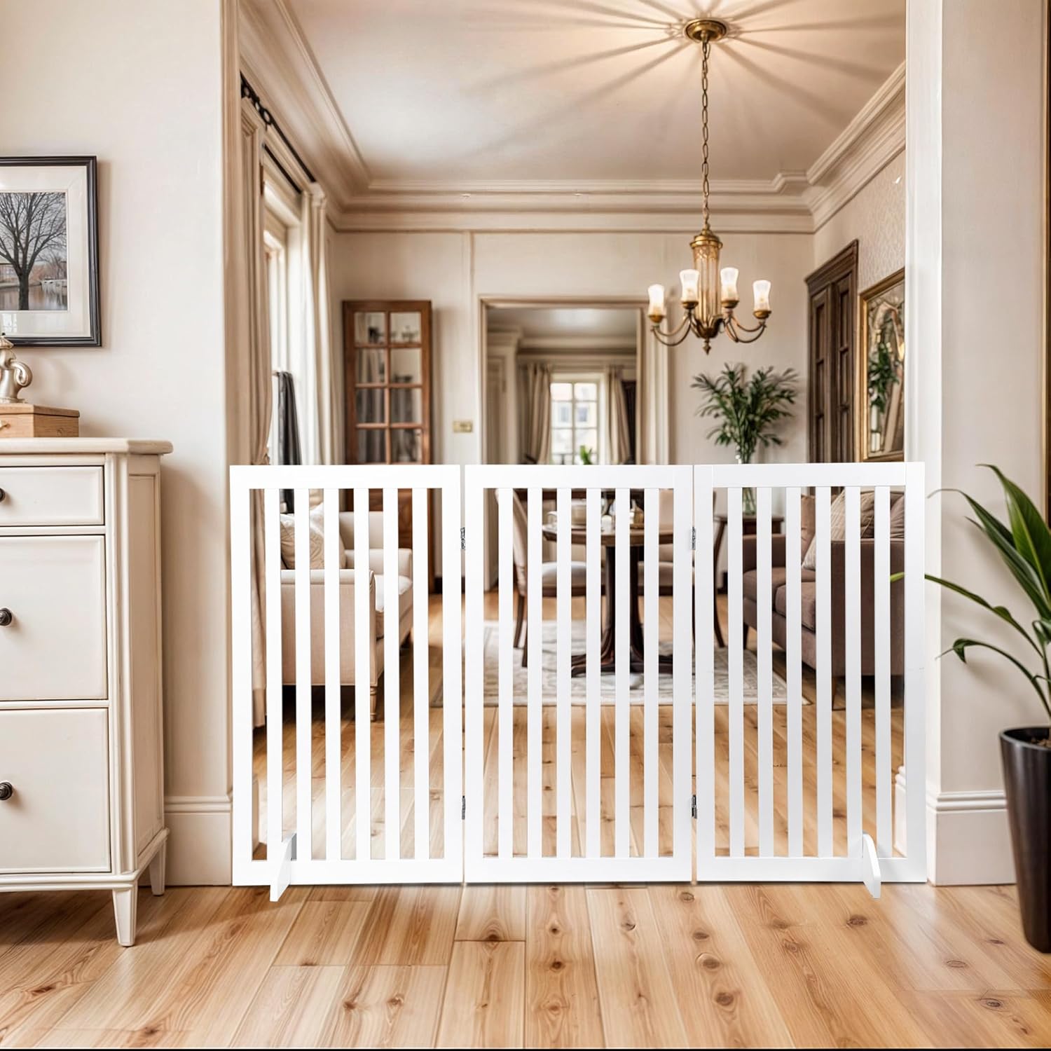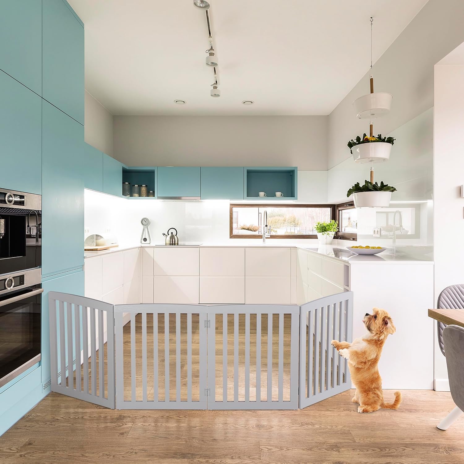 Specifications:Color: White Material: MDF + Metal Open Size: 80"W x0.75"D x 24"H Fold size: 20.5"W x 3"D x 24"H Net Weight: 20.06 LB Package Includes:Foldable Dog Fence x 1Instruction x 1