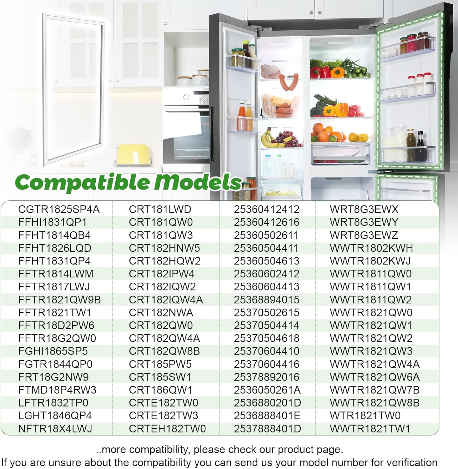 Material: Rubber Color:White Product Dimensions:41.6 x 28.5 x 0.76 inches Packing weight: 2.53 lb Package Dimensions:14.96 x 7.87 x 3.14 inches Package Contains:242193206 Refrigerator Door Gasket 242193206 Refrigerator door gasket is suitable for numerous models including CRT181QW3 and CRT182HQW4. The replaceable part numbers are 3513463 and AP5806733, etc. It adopts thick magnetic strips and EPDM rubber material, with strong sealing performance, good cold resistance and elasticity. It can recover after deformation. Installation is convenient without tools, and it can be completed in just a few minutes. It is a good choice for efficient and durable accessories.
