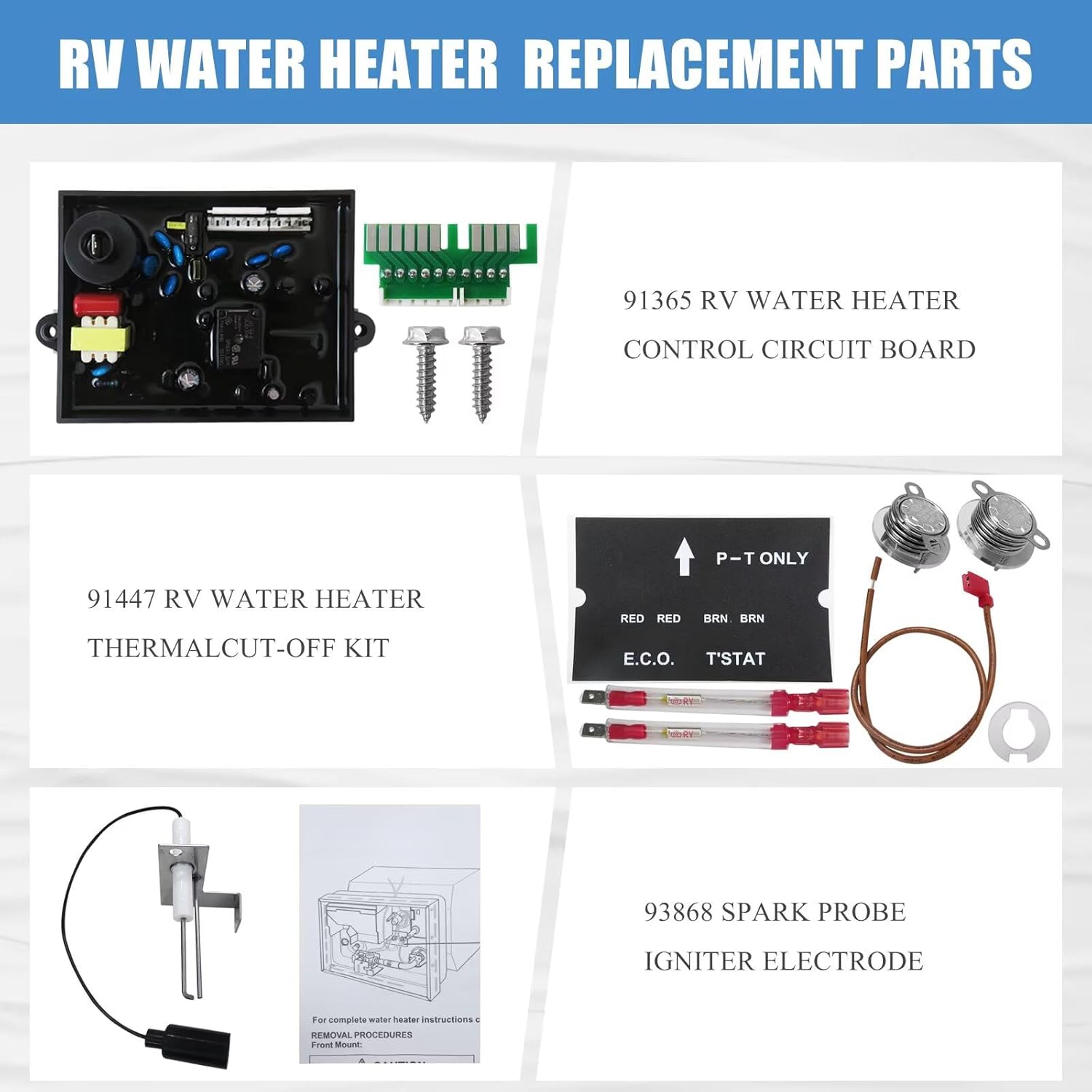 An Integrated Kit: RV water heater integration kit integrates the 91365 circuit board, 91447 thermal cut-off thermostat kit, and a 93868 igniter electrode. It provides a one-stop repair and replacement solution for your RV water heater.Wide Compatibility: Suitable for Atwood Dometic RV water heater GH6-3E/4E/6E/7E/8E; GCH6-3E/4E/6E/7E; G6A-2E/3E/4E/6E/7E/8E; GC6A-7E; GCH6A-7E/8E/9E/10E; GC6AA-7E/8E/9E/10E; G10-1E/2E/3E; GC10-1E/2E; GC10A-2E/3E/4E; GH10-1E/2E/3E; GCH10A-2E/3E/4E; G610-3E; GH610-3E; XT 6 and 10 Gallon Series.Du rable and Reliable: Water heater replacement parts kit's components are all made of high-quality materials and have undergone rigorous quality control and durability testing to ensure long-term stable ope ration, making your RV trips more worry-free.Effortless Replacement: RV water heater kit includes an installation guide manual, which can help you repair issues such as ignition failure, water temperature imbalance, and fuse blowouts caused by component damage. It can also be kept as a spare kit for unexpected needs.