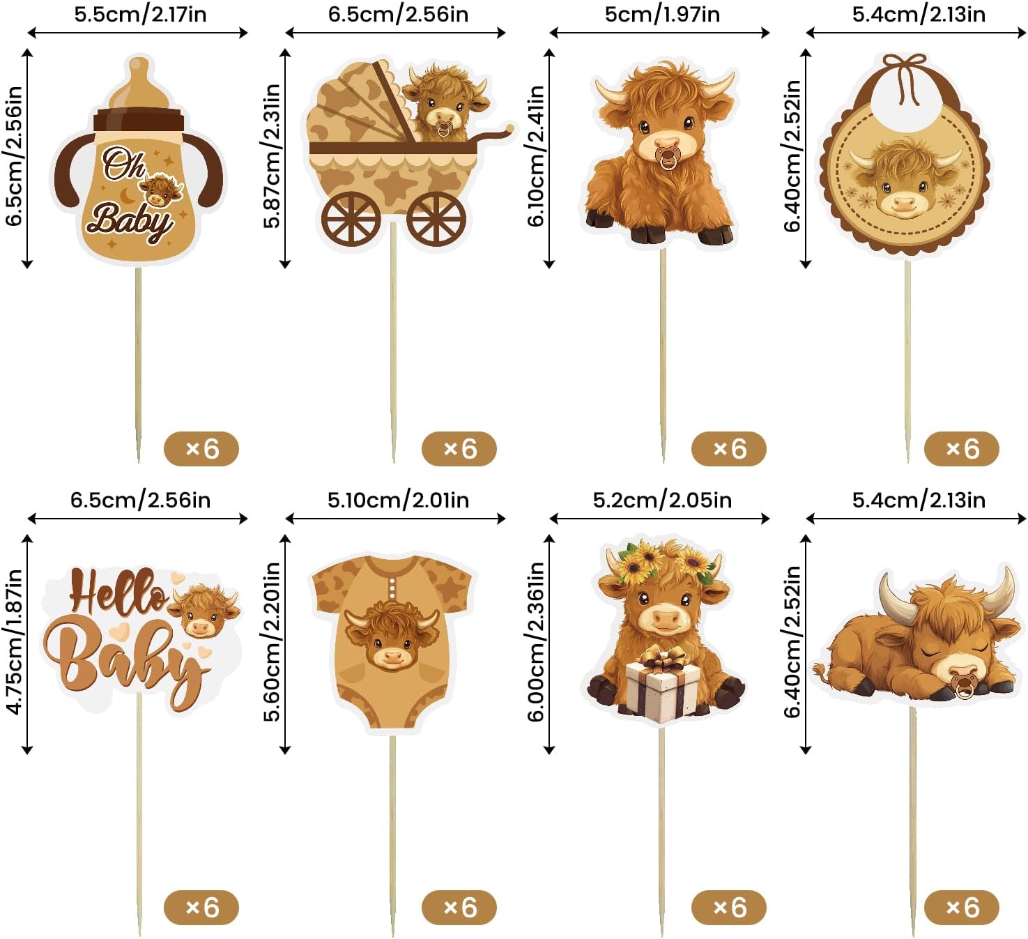 48-piece set includes 8 unique Highland cow-themed designs, featuring playful cow motifs, baby bib, jumpsuit, stroller and "Hello Baby" signs and more—perfect for creating a atmosphere of any birthday baby shower party