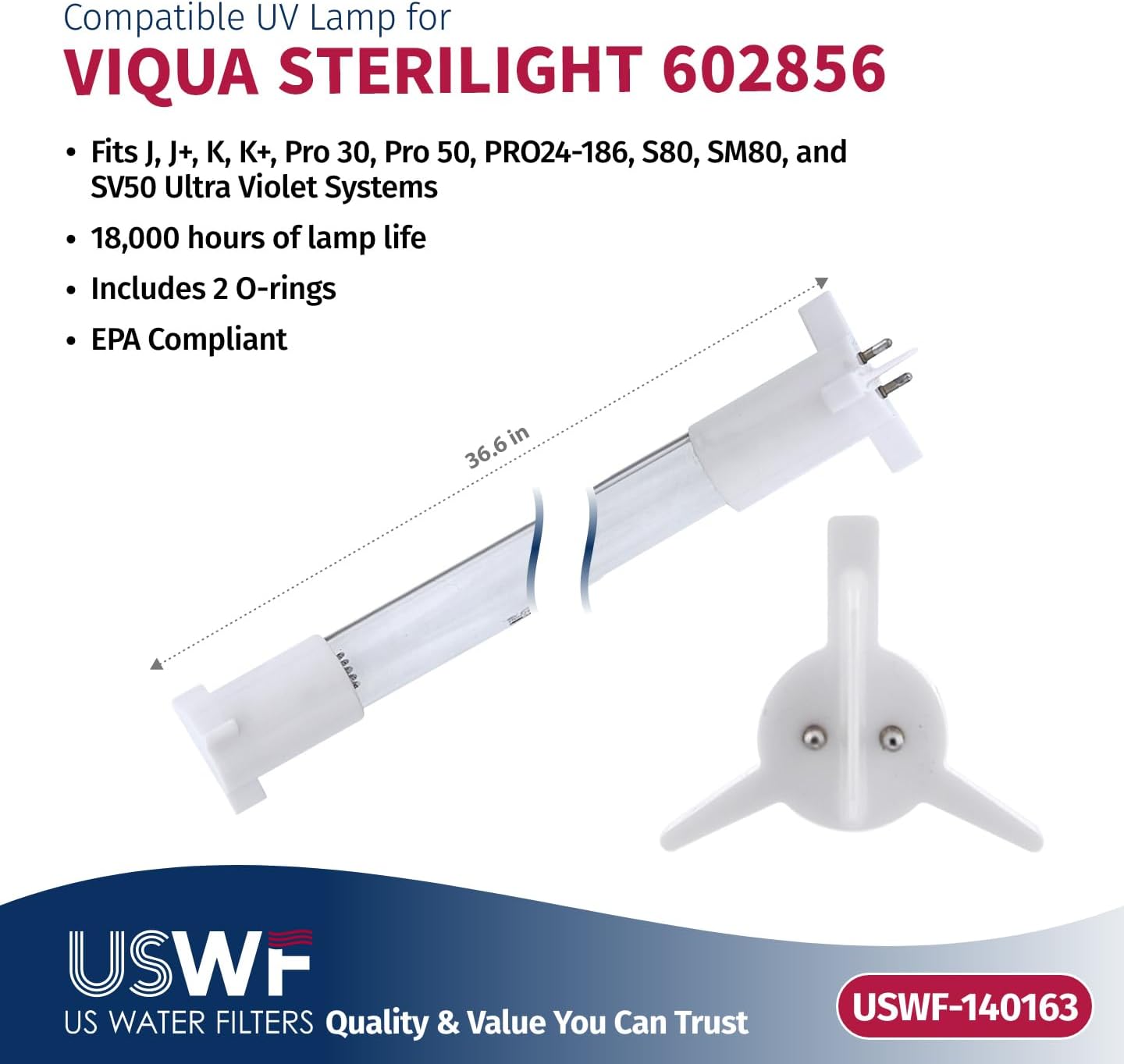 Looking for a value driven, alternative solution to your name brand "factory" replacement UV lamp and sleeve US Water Filters replacement lamps and sleeves are made in the US to the exact same stringent manufacturing protocols, and are backed by a one-year, no-hassle warranty. The USWF-163059 is a replacement for VIQUA 602850-102 Lamp/Sleeve replacement combo pack used in the VIQUA J, K, PRO30, PRO50 ultraviolet water systems. This high-performance amalgam UV lamp reduces maintenance requirements by lasting up to 2 years before needing replacement. After 18,000 hours the UV light weakens and isn't strong enough to properly treat your water. Replacing your lamp annually to ensure optimal system performance. The quartz sleeve is an important part of the UV water treatment system. It protects the UV lamp from coming in contact with the water while allowing the UV light to penetrate the water. Minerals from the water will build up on the sleeve over time causing the sleeve to become cloudy not allowing the UV light to penetrate the water as effectively. Once the mineral layer on the quartz sleeve cannot be removed via cleaning, or the sleeve cracks or breaks it's time to get a replacement. USWF-163059 includes the USWF-140163 lamp, USWF-350059 sleeve, and 2 o-rings to ensure you can replace the o-rings after every cleaning and lamp replacement. Safety Note: NEVER look directly at the UV lamp when it is powered on. Follow the instructions carefully to avoid injury to eyes and skin.