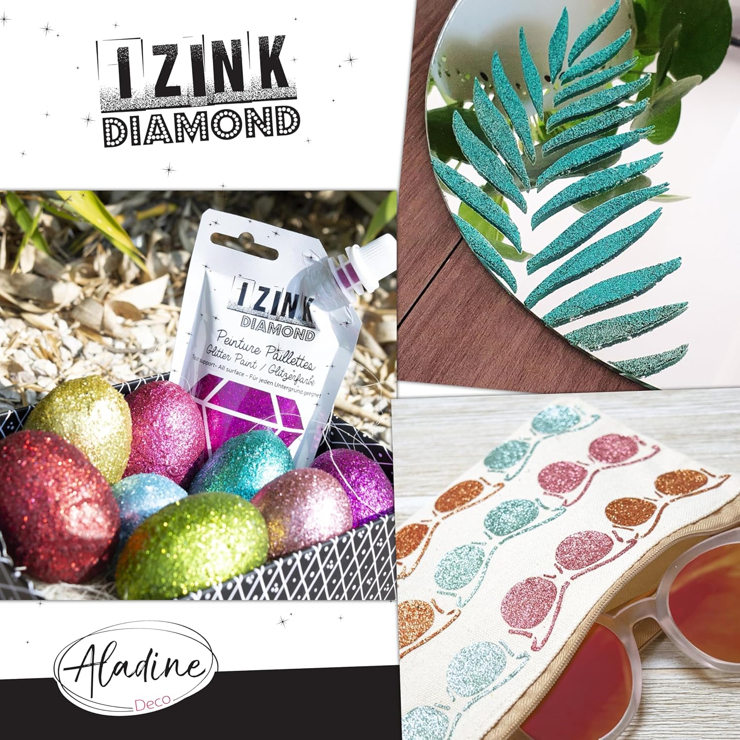 ✔ Izink Diamond makes your coloring sparkle! Extremely flake-filled paint, easy to use and store in its gourd format, Made in France, it can be applied to all substrates. ✔ The Gold colour is one of the 24 colours available in the Izink Diamond range. Beautiful colours and metallic colours (gold, silver, copper) to combine to obtain infinite effects and shades. Very covering, you can apply Izink Diamond with a spatula (Aladine 3D Paste Spatula also available) using stencils. Find our online video tutorials to fill up with ideas! ✔ Izink Diamond can be applied on paper as well as on metal, concrete, textile, wood and of course on any object to decorate. . . It is often used and appreciated to customize clothes, bags, pillow cases: these textiles can then be washed in the machine (up to 40° - before washing the textile in the machine, iron it 5 minutes to fix the paint) ✔ The innovative format in flexible gourd of 80 ml will allow to measure the product as close as possible to your use. You can apply a little paint directly to your substrate without using an intermediate container. The bottle allows a clean, economical use and optimal conservation. Easy to close and open, this packaging is also recyclable for eco-responsible creativity! ✔ Do It Yourself is finally accessible to everyone! Personalize your accessories and objects with paint, stencils, Stampo. . . Create cards, invitations, make your own notebooks and bring colour and personal touch to your everyday objects. Passionate about creative leisure, Aladine is here to bring creativity, spontaneity and simplicity to all your creative desires.