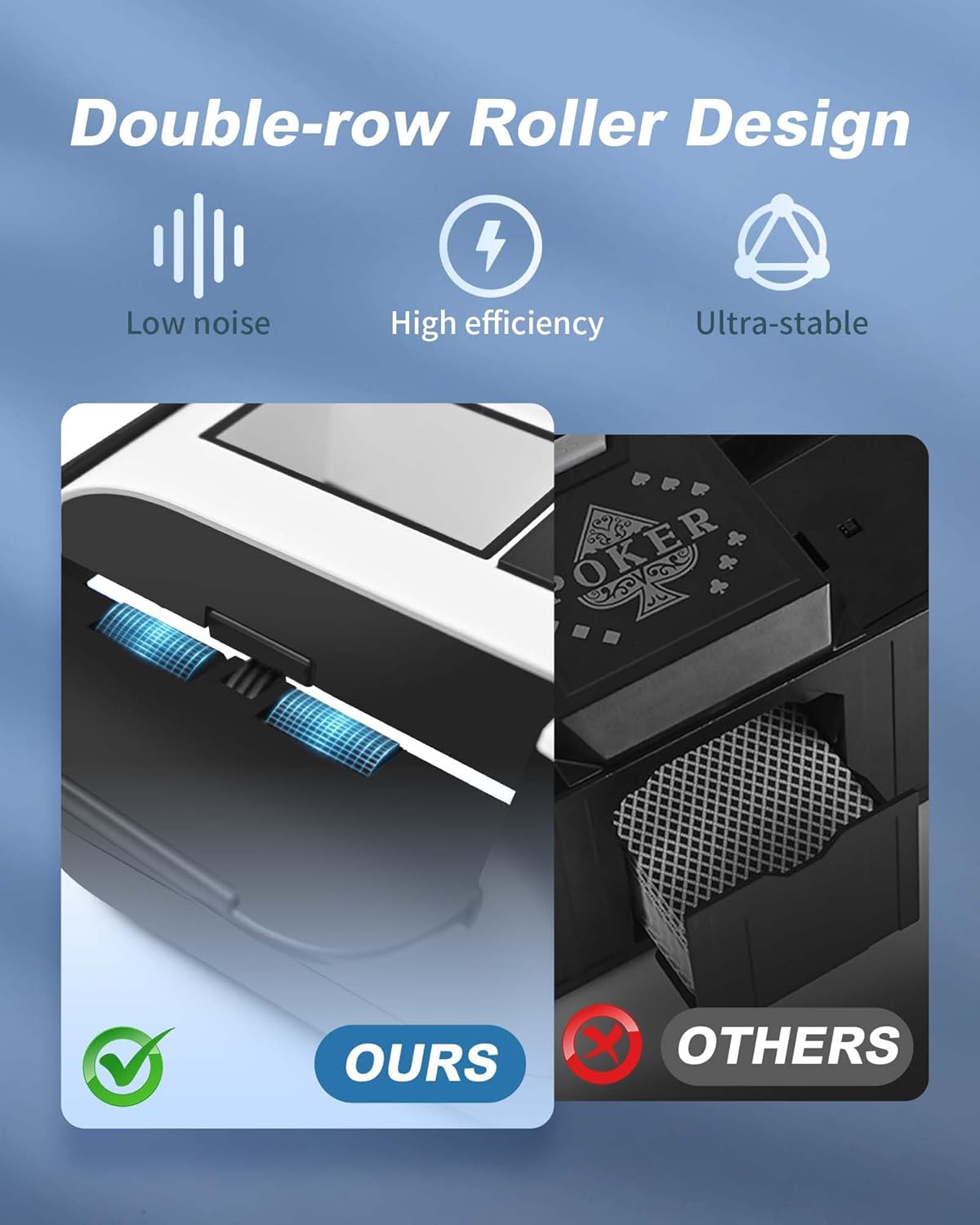 • [HIGH-EFFICIENCY LOW-NOISE MOTOR] - The UNO card shuffler features a new high-efficiency low-noise motor, operating at 10,000 RPM, With a powerful belt-driven system, it runs more stably and quietly, capable of shuffling 2 decks in just 2.5 seconds, and accurate shuffling while minimizing card issues. This ensures minimal disruption and maximum enjoyment for card game enthusiasts!