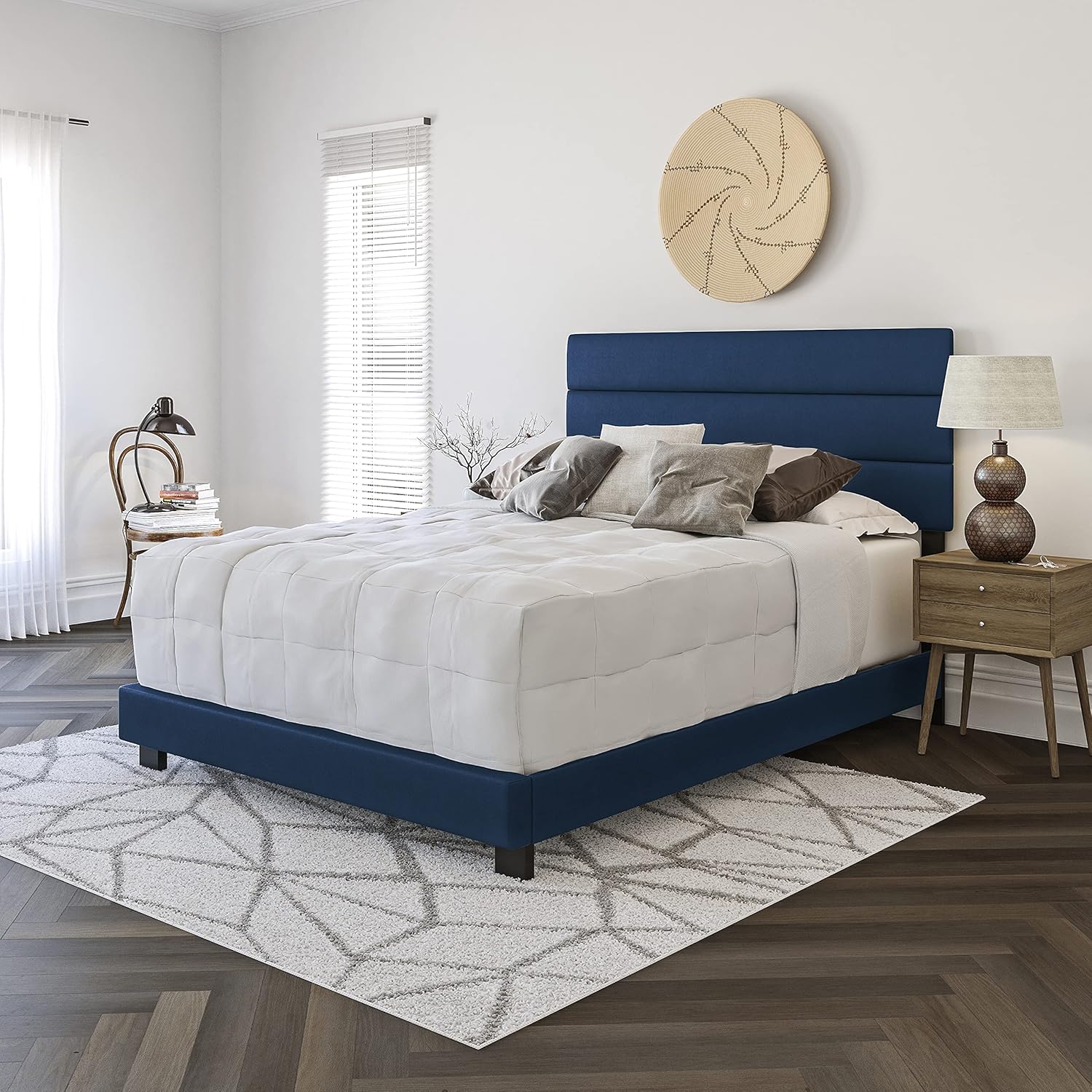Introducing the Boyd Sleep Milan Upholstered Platform Bed Frame – a modern addition to your bedroom furniture that seamlessly combines style, comfort, and functionality. This bedframe with headboard is the epitome of elegance, available in many soft linen fabric upholstered colors to complement any bedroom. Crafted with high-quality materials, this upholstered bed frame ensures a restful night's sleep. It's also available in king size, queen size, full size, and twin size, choose to suit your preferences. Box spring, foundation, or other mattress support required. The Milan Bed Frame is designed with sturdy wooden slats and noise-free construction. Easy 30-minute assembly means setting up this bed is a breeze, with all parts conveniently zipped in the back of the headboard (Philips screwdriver required, not included). Transform your bedroom with this faux leather upholstered bed frame, available in four bed frame sizes. Add comfort and style to your bedroom with the Boyd Sleep Milan Upholstered Platform Bed Frame.