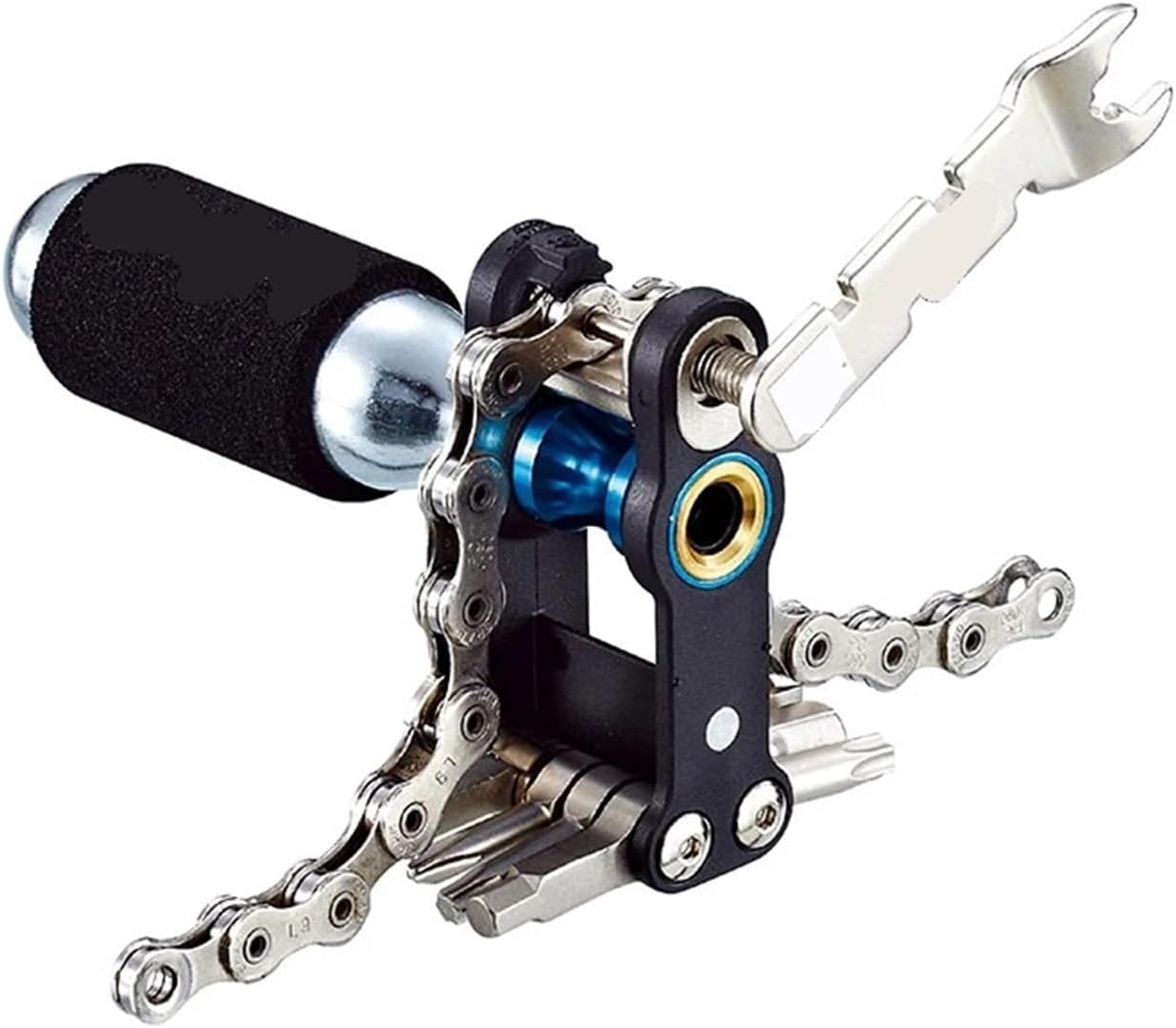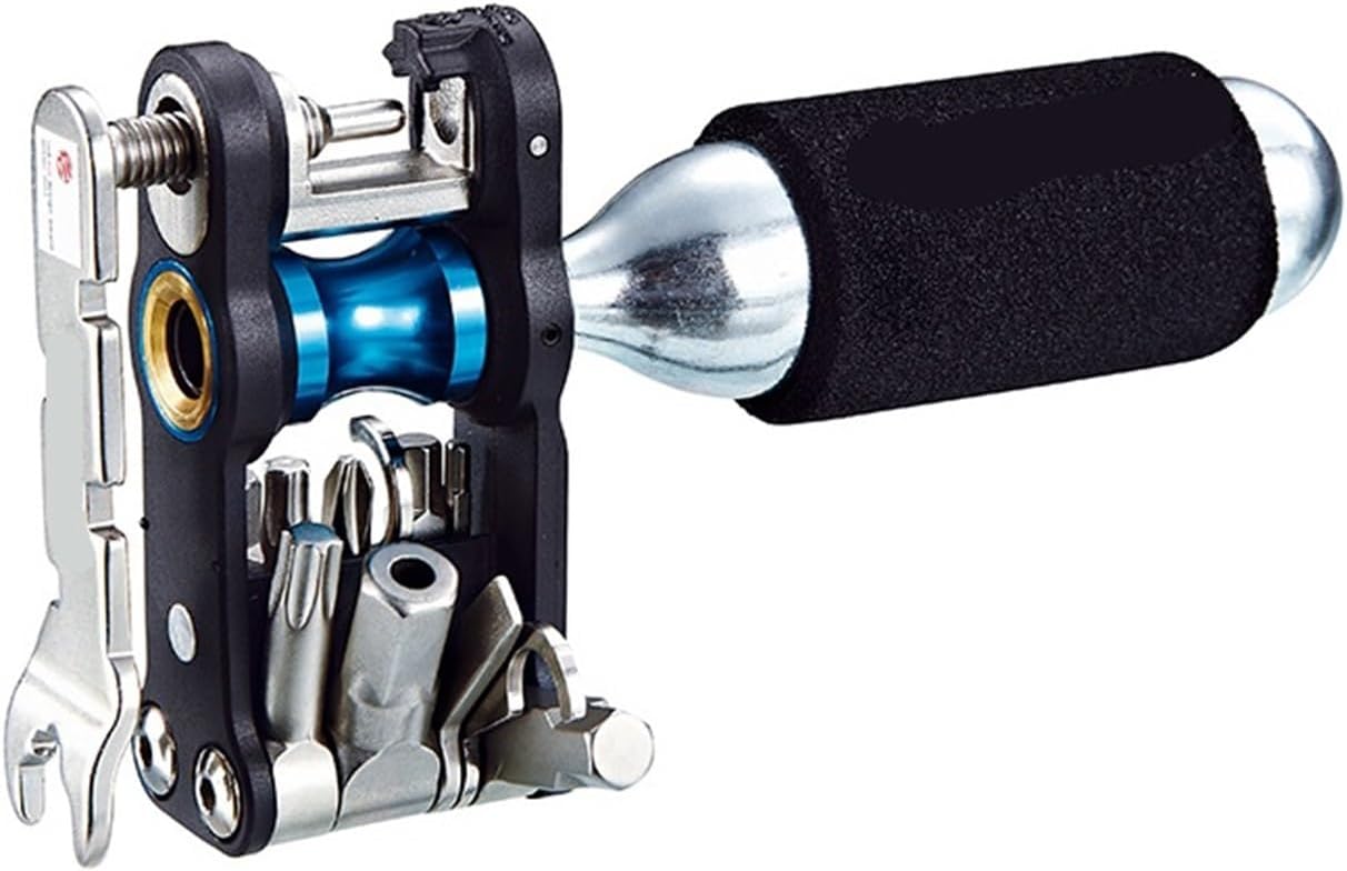 18-in-1 multi-tool - light and small, easy to carryPatented chain breaker and chain holderAllen key (1.5/2/3/4/5/6/8mm)Word/cross screwdriver, #25/#30 star wrenchWire wrench (3.23/3.3/3.45/3.96 and 10mm)CO2 cylinder nozzle is suitable for American mouth / French mouthType : Multifunction Tools