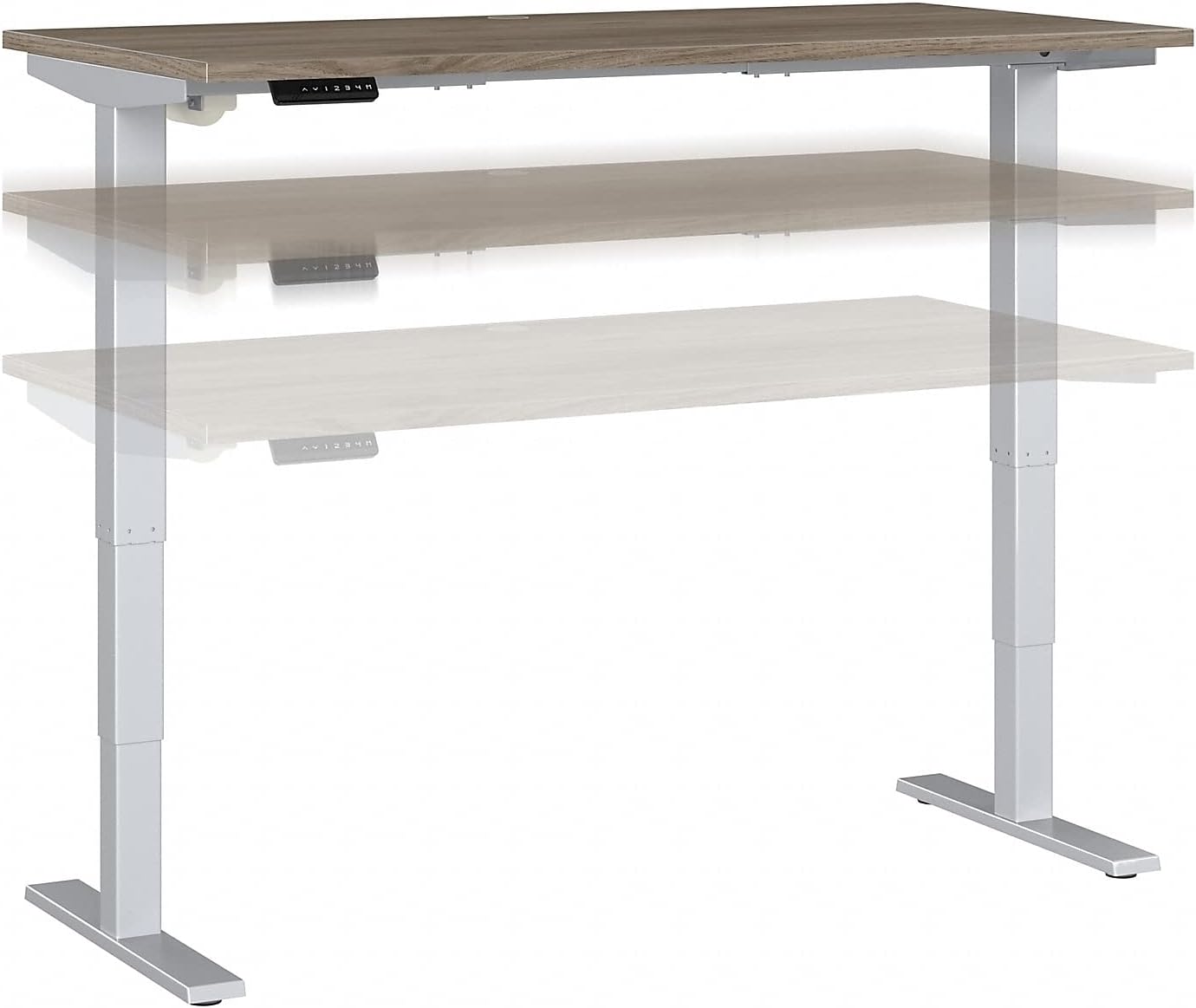 Bush Business Furniture's Move 40 Series Electric Height Adjustable Standing Desk is a perfect way to build an ergonomic workspace without the high-end price tag. Give your body and mind a break from sedentary work and enjoy a healthier, more productive office with the push of a button. Three stage units lift the 60W x 30D desktop anywhere from 28 to 48 inches from the floor at a speed of 1.25 inches per second. The control panel includes four programmable presets that save your favorite heights so you can change positions without missing a beat. The Adjustable Desk also features an Anti-Collision Sensor that stops movement up or down if an object is detected. Built to endure the rigors of a busy professional environment, the durable thermally fused laminate work surface is resistant to scratches and stains while a welded 16-gauge steel base allows the desktop to support up to 176 pounds. The 10-foot power cord plugs into a standard outlet so the Sit-Stand Desk can be used in virtually any setting. This Ergonomic Office Desk has been rigorously tested to meet or exceed ANSI/BIFMA quality standards for safety, durability and performance and is backed by a 5 Year Warranty.