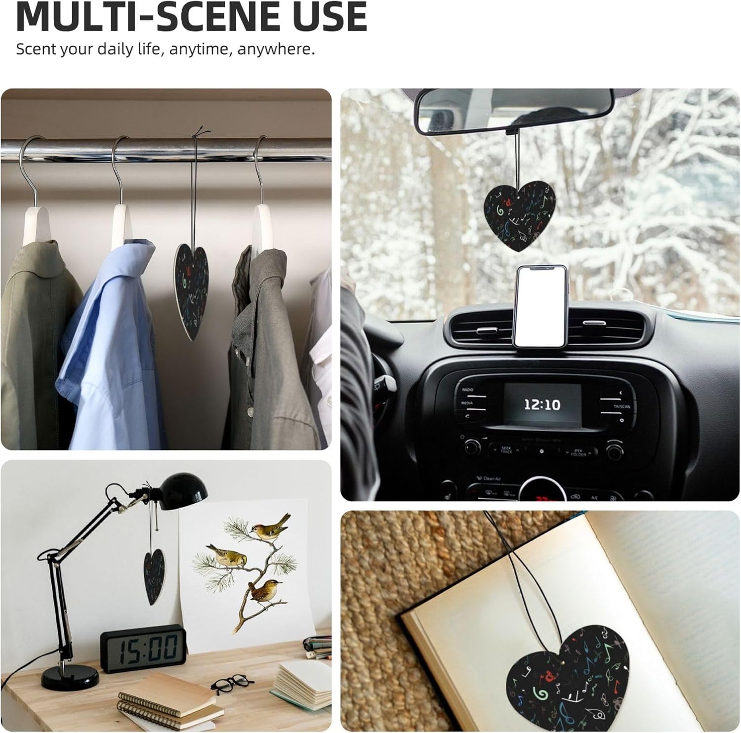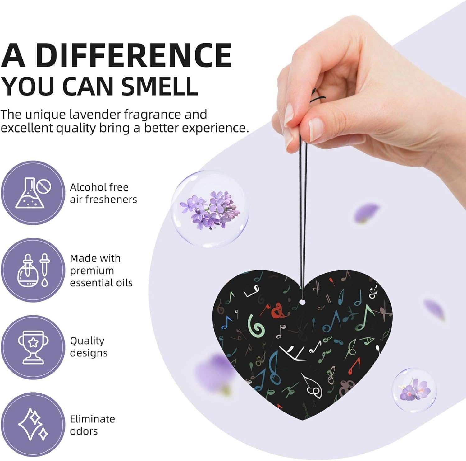 unobstructed vision: this Music Note rearview mirror scented fresheners doesn't obstruct your vision while driving, ensuring a safe and comfortable journey every time.easy hang: we've included a convenient rope for hanging, making it super easy to attach this christmas air freshener wherever you prefer. No fuss, no mess - just hang and enjoy the fragrance.incredible package deal: this rearview mirror pendant aromatherapy tablets package includes 6 pieces in 6 captivating designs and 1 refreshing scents (lavender). Experience a variety of delightful fragrances that will keep your surroundings smelling wonderful throughout the day.environmental protection: the car air fresheners for women smell can last for about 1-2 weeks. When the smell fades, you can add your favorite perfume. Continue to use, reusable6 pcs included: you will receive 5 individual shoe cabinet fresheners, each in its own package; enjoy consistent scents for nearly a year, or share them with your friends or families