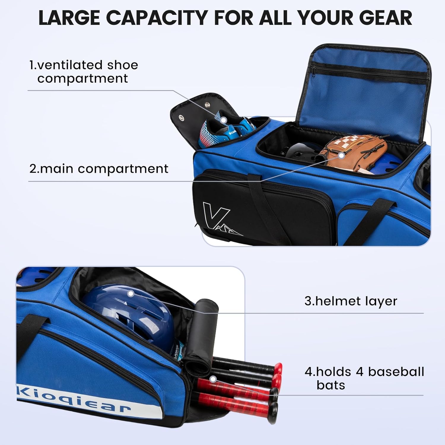 Product Description: Kioqiear Rolling Baseball Bag with Wheels for 4 Bats Designed for athletes who strive for excellence—from rising talents to experienced adult players—this gear bag combines intelligent design with a high-strength protective structure, serving as your versatile and reliable companion in baseball, softball, hockey, lacrosse, and more.Smooth Mobility·Steady & Silent Equipped with 360° omnidirectional silent wheels and a reinforced wear-resistant base, it glides effortlessly across gym floors, outdoor gravel, grassy slopes, and more.Organized Storage·Zoned for Efficiency Features a scientifically arranged interior with 3 dedicated compartments (for gear, shoes/clothing, and accessories), 4 baseball bat sleeves, and 2 multi-purpose expandable pockets—keeping helmets,gloves, pads and apparel neatly organized and easily accessible.Hang Convenience·Keep Gear Clean & Dry Includes a secure 2-point quick-hook system for easy hanging on fences, racks, or locker hooks, keeping the bag off wet or dirty ground and your gear ready to use.Made from high-density 600D reinforced Oxford fabric with tear-resistant and abrasion-resistant coating, it stands up to mud, and the wear and tear of seasons of competition.