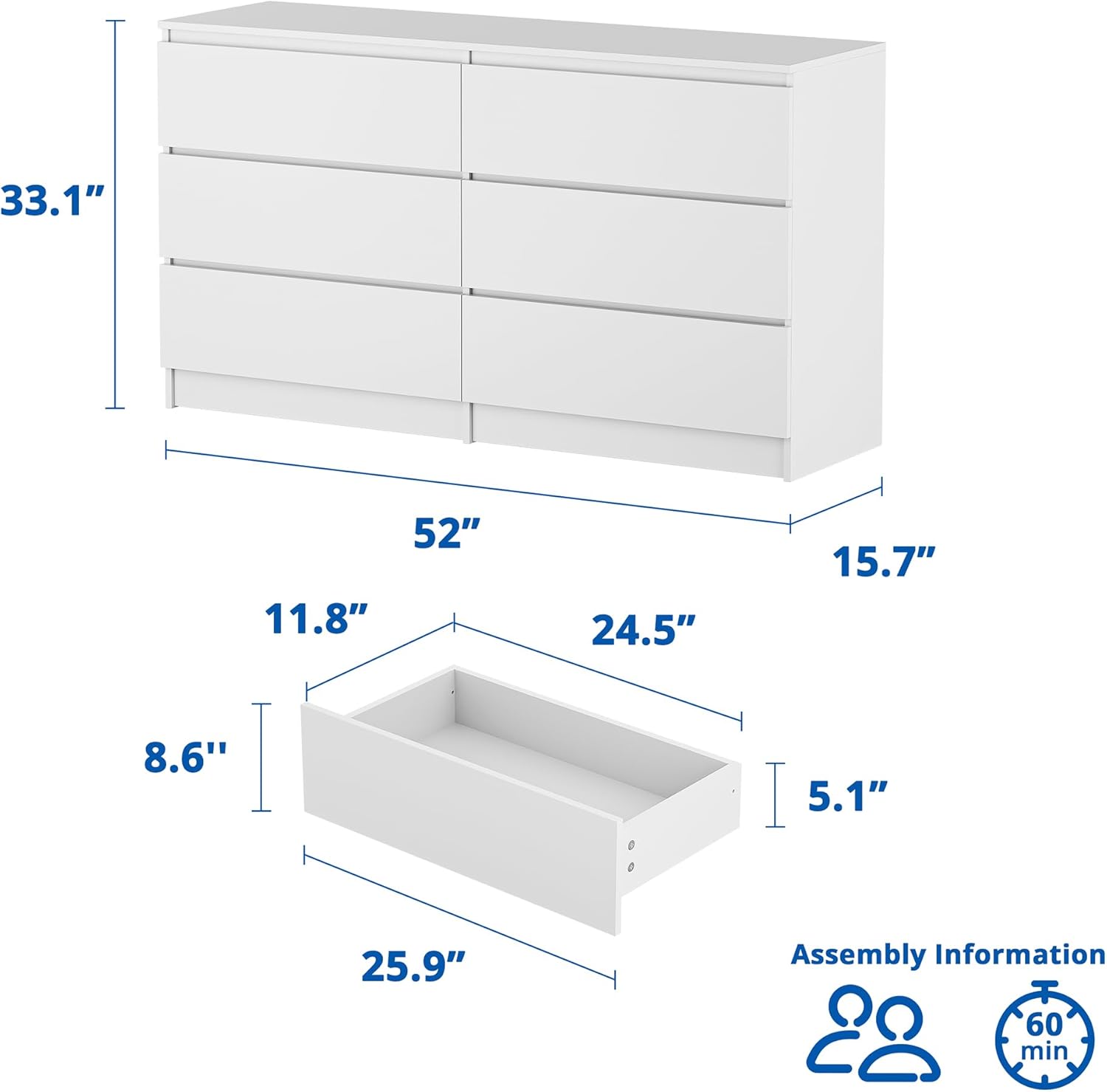 | Size | 15.7"D x 52"W x 33.1"H (6 Drawers) |