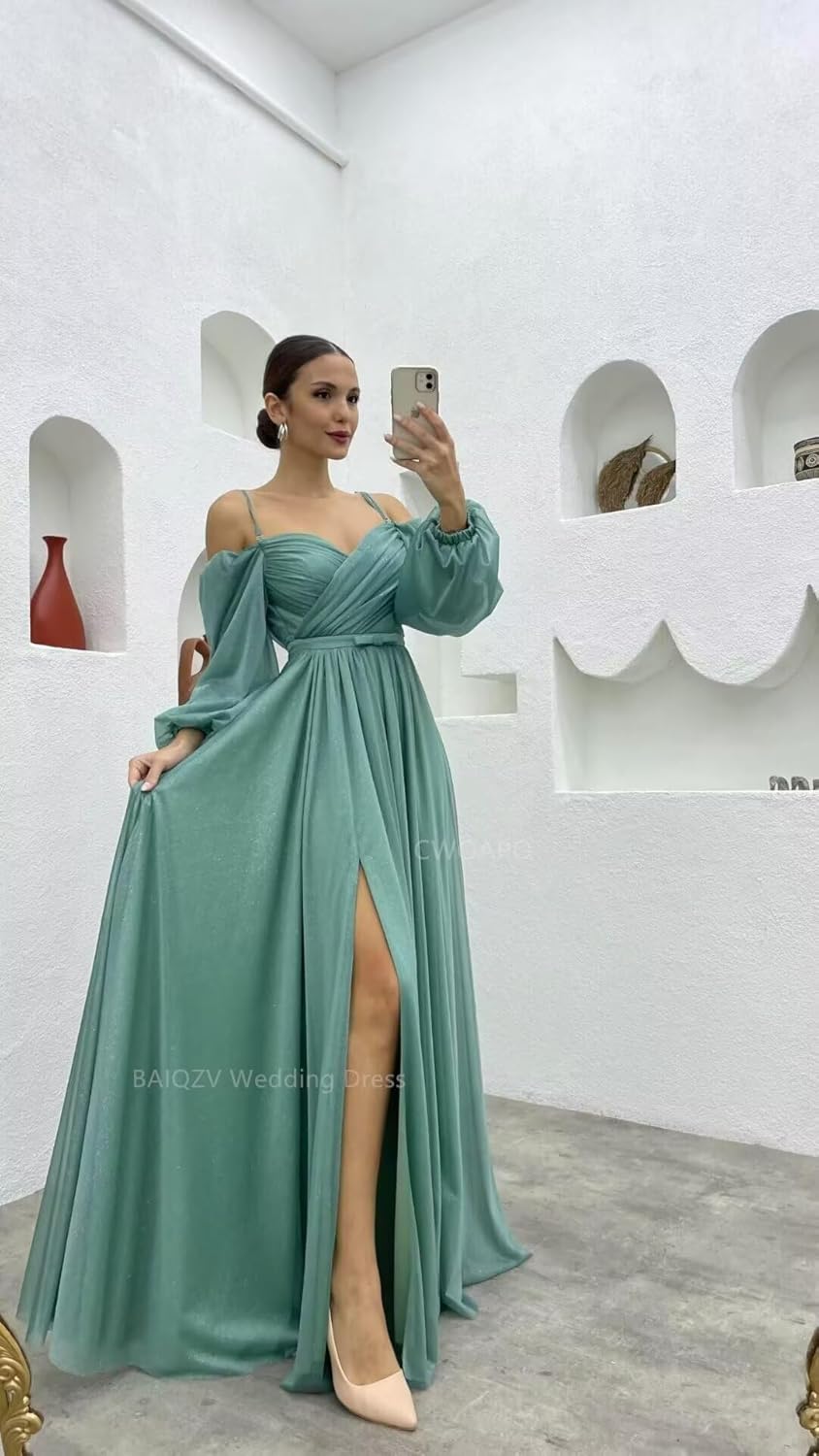 | Fabric Type | CWOAPO Fabric:Off The Shoulder Long Sleeve Chiffon Bridesmaid Dresses Long Slit Spaghetti Strap Wedding Guest Gown A Line Formal Dress for Women |