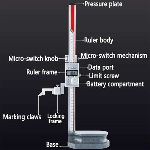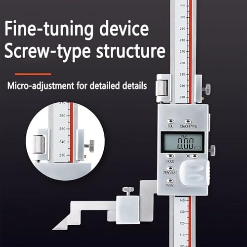 The Digital Height Gauge is a precision measuring tool designed for accuracy and reliability. specifications: 0-200mm, catering to a variety of measurement needs. Constructed from durable stainless steel, this gauge ensures longevity and resilience. The measuring range spans from 0 to 1000mm with a resolution of 0.01mm, providing detailed and precise measurements. The accuracy of the gauge varies depending on the range, ensuring precise results with an accuracy of ±0.03mm for 200mm, ±0.04mm for 300mm, ±0.05mm for 500mm, ±0.06mm for 600mm, and ±0.07mm for 1000mm. This tool is ideal for professionals and enthusiasts seeking accurate height measurements.
