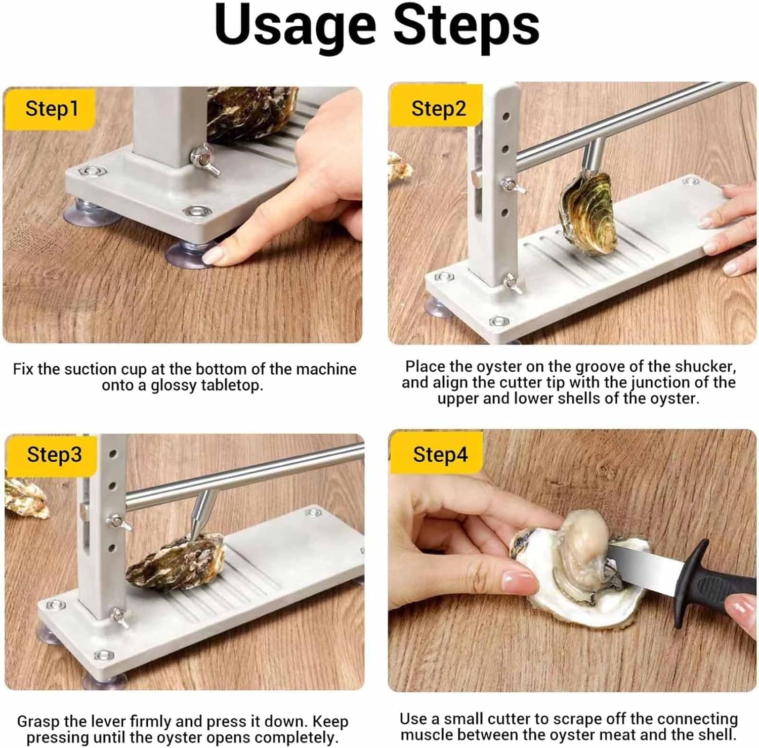 Easy to Operate: Secure the suction cup to the bottom of the machine, place the oyster in the groove, and align the tip with the joint between the upper and lower shells of the oyster. Then, press down on the handle and use the included cutter to gently scrape the oyster meat and the Cover, simple and convenient Specification: Item Type: Oyster Shucker Tool Material: ABS, Stainless Steel, Aluminum Alloy Press Rod Length: Approx. 48cm / 18.9in Base Size: Approx. 10 x 28cm / 3.9 x 11in Note: This product requires self-assembly. PackageList: 1 x Oyster Shucker Base 1 x Oyster Shucker Support Rod 1 x Oyster Shucker Press Rod 1 x Oyster Shucker Extension Pole 1 x Fixing Clamp (Random Color Style) 2 x Oyster Shucker Cutter (Unsharpened) 2 x Gloves