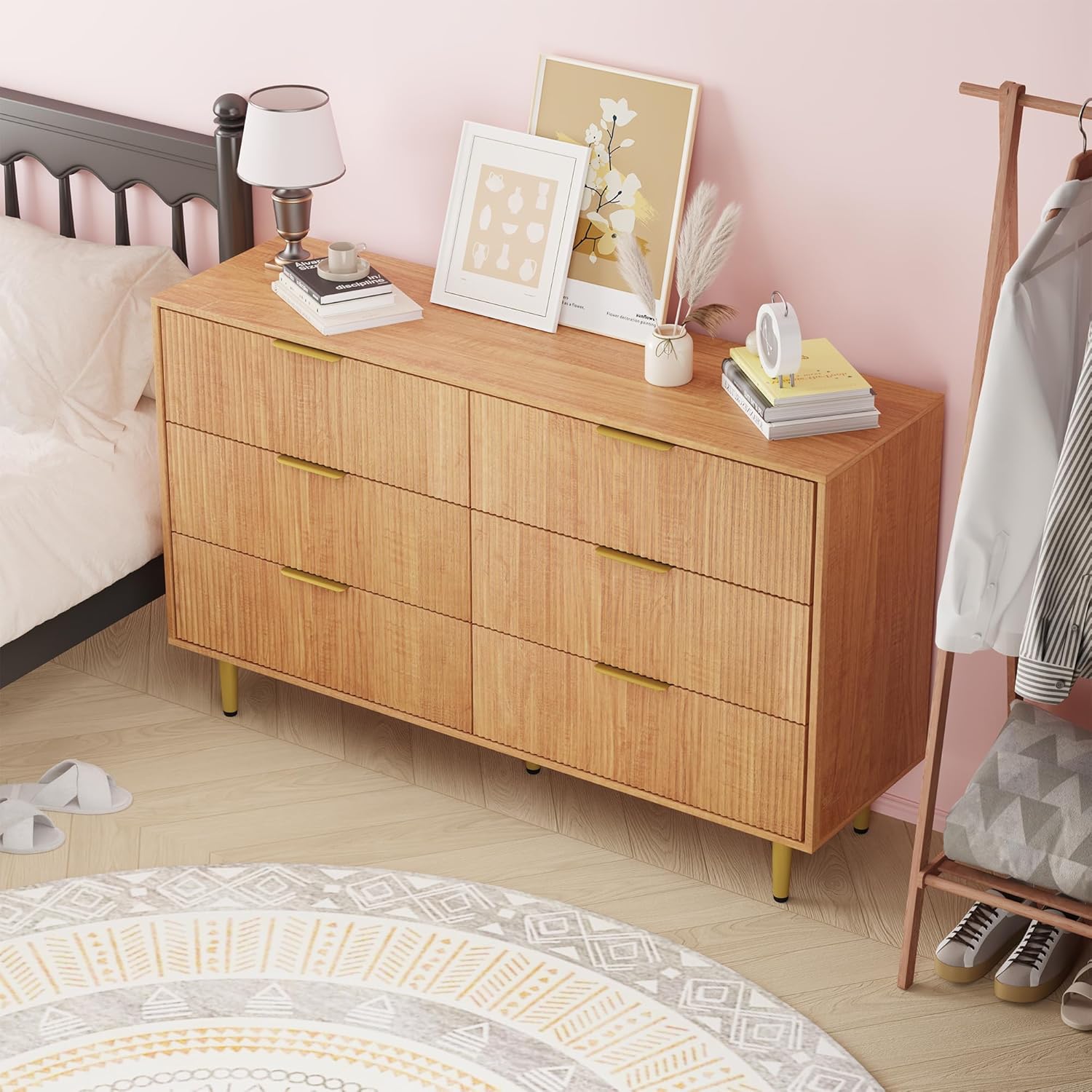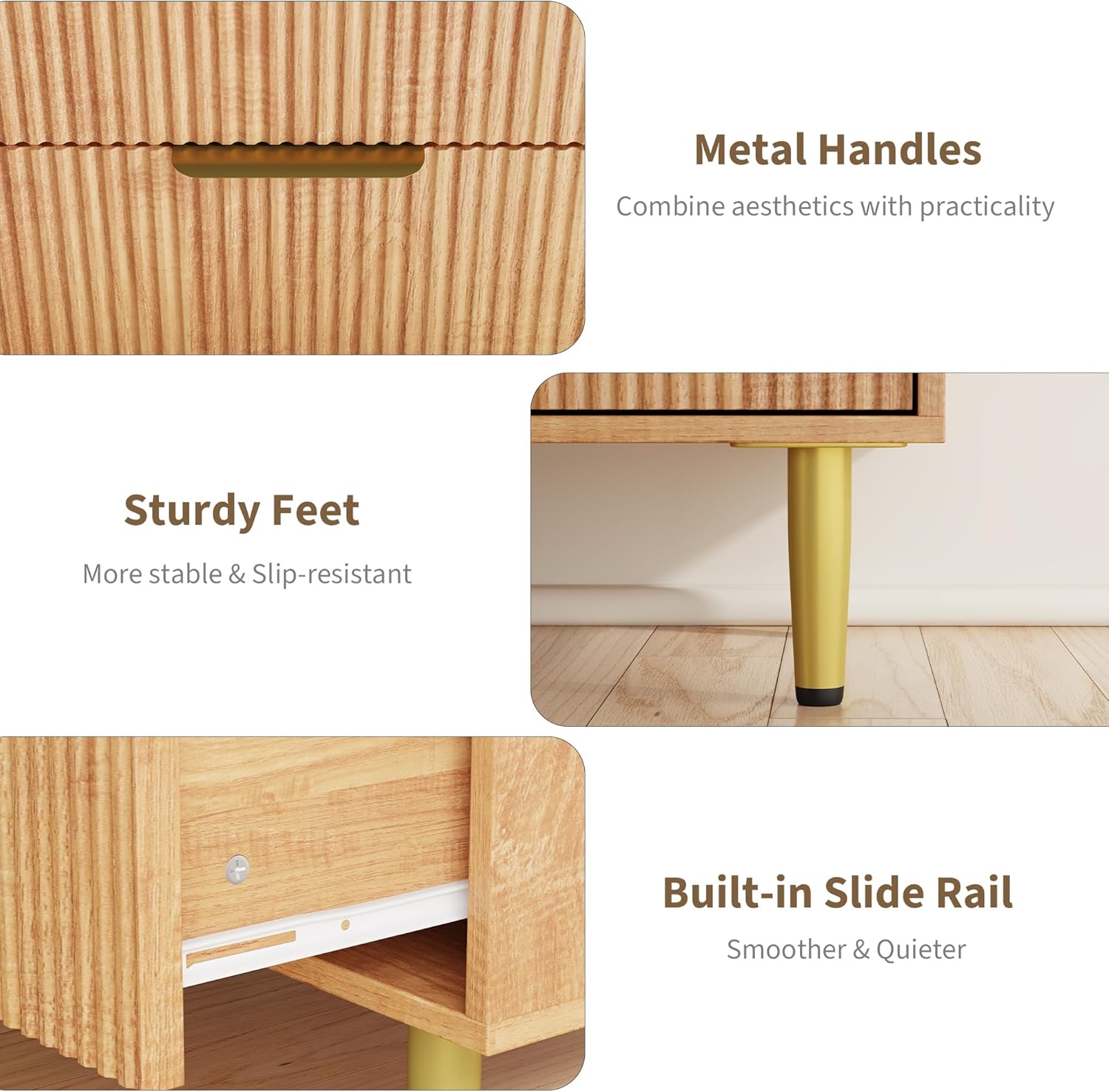Upgrade your space with this modern fluted wood dresser—compact yet spacious, stylishly designed, and perfect for effortless storage in any room!Highlights at a Glance:- Modern fluted dresser with gold metal handles and legs - Compact wood dresser for bedroom or apartment - Chest of drawers storage organizer with three spacious drawers - Sturdy dresser chest with strong metal legs - Versatile closet dresser for living room or entrywaySpecification:Dimension: 28x17x30 inch/30x18x48 inch/56x18x34 inchMaterial: Engineered Wood+MetalPacking List:1xDresser1xInstruction ManualNote:Please check the product dimensions to ensure the dresser fits your intended space before purchasing.Use the included detailed instruction manual and follow each step closely for safe and efficient assembly.Place the dresser on a flat, stable surface to maximize sturdiness and stability.Avoid placing heavy or unstable items on top of the dresser to prevent tipping or surface damage.Clean the wood surface with a soft, damp cloth; do not use abrasive cleaners to maintain the dresser's finish.
