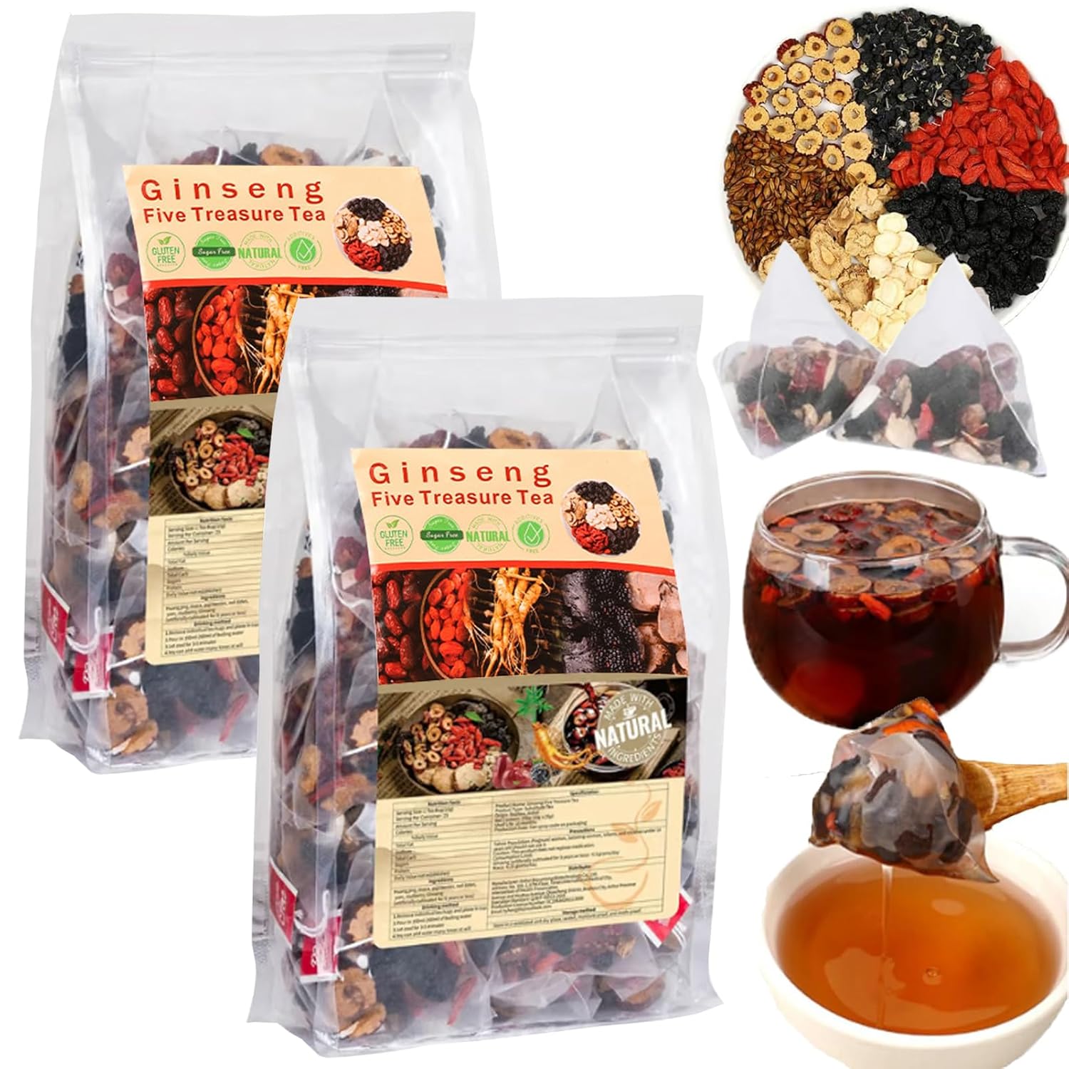Product Description All natural herbs, Real good tea bags, each pack let you drink at ease. Authentic selected ingredients, Strict selection of authentic raw materials, layers of screening, multiple ratio, just to give you a better experience. Drink a glass a day and enjoy life, Herbal formula / Sweet taste / Balanced texture, Every part of the matching is carefully selected. Specifications: Name: Ginseng & Mulberry Herbal Tea Ingredients: Ginseng(Five years or less artificial planting), Wolfberry, Red wolfberry,Jujube,Barley,Maca,Black wolfberry,Mulberry Shelf Life:12 Months Net content: 5g * 30 Bags/1Boxes Storage:Placed in a cool dry place,after opening your eat as soon as possible Package includes: 1/2/3/5 pc * Ginseng & Mulberry Herbal Tea Note: 1. Due to manual measurement, please allow a difference of 1-5g/1-2cm. 2. Due to different displays and different lighting, the picture may not reflect the actual color of the item. Thank you for your understanding.