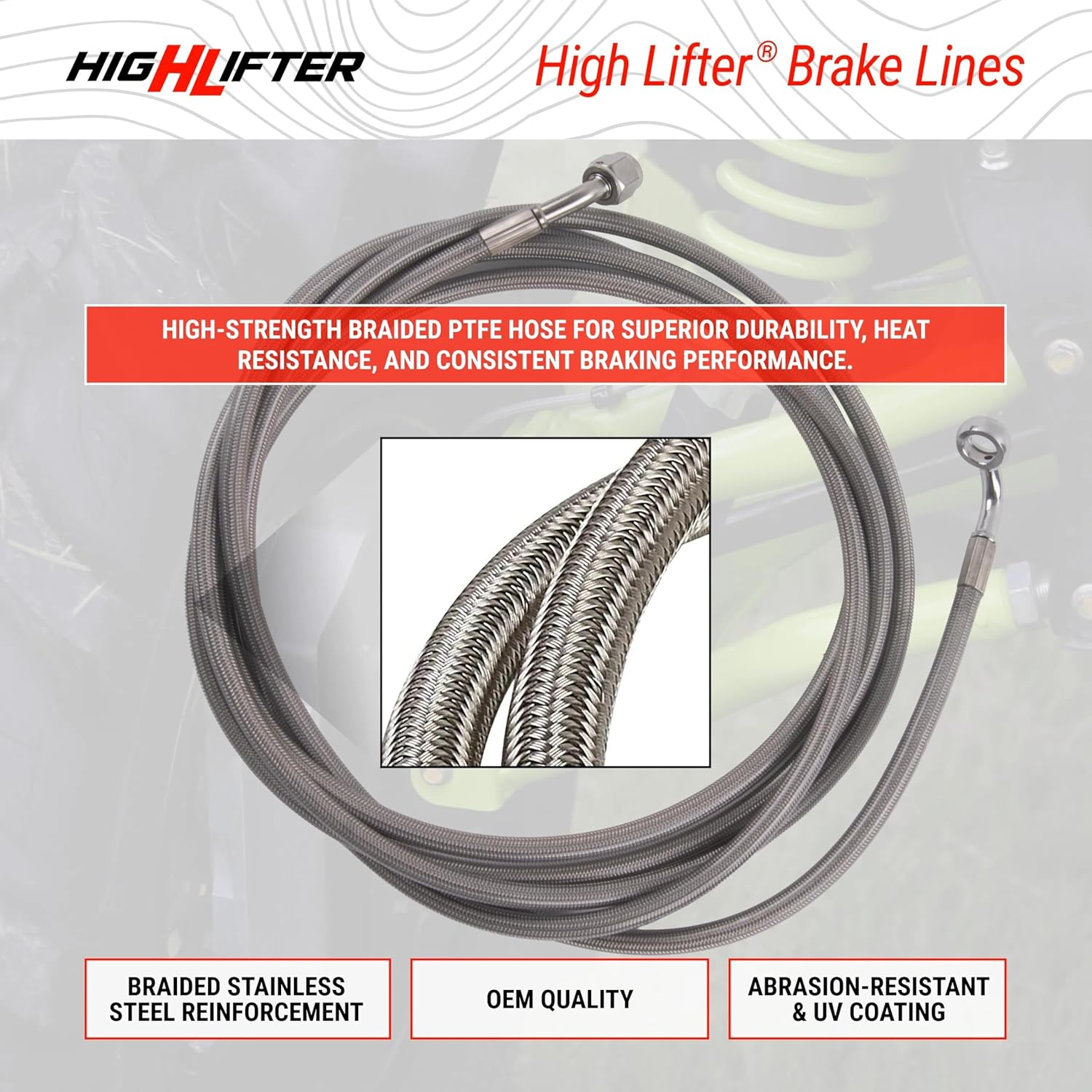 Replacement brake hose line compatible with Can-Am Outlander 1000, 850, 650 & Renegade 1000R XMR (2017-2023) ATV models equipped with High Lifter Big LiftsFeatures7.5mm braided stainless steel reinforcementBanjo bolt fittingsUV & Abrasion-resistant coatingImproved pedal response and feelCorrosion-resistant fittingsOEM qualityMade in USAIncludes 45" Rear Brake LineWARNING: This product may alter machine performance. The customer is responsible for confirming compatibility, proper installation, and understanding how it may affect operation