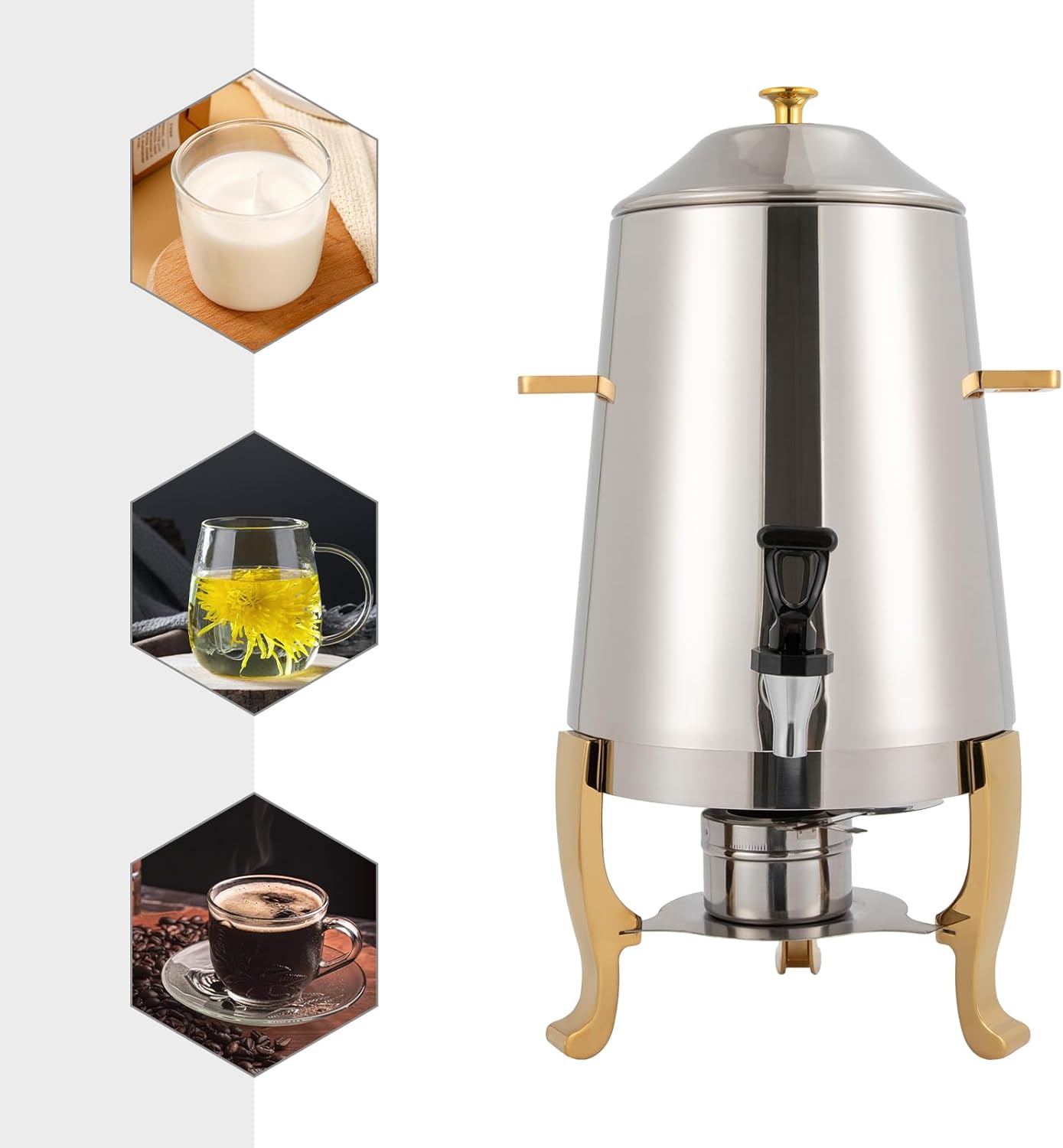 DescriptionWhether you're serving fresh coffee, tea, hot chocolate, or other hot beverages, this hot beverage dispenser is ideal for keeping warm. The excellent stainless steel material, exquisite workmanship, stylish outlook, and convenient design make the hot water dispenser stand out, which is an ideal choice for use at hotels, restaurants, and various catering events and parties.SpecificationsColor: Silver, GoldMaterial: Stainless Steel, Aluminum AlloyMount Type: Free StandingSurface Treatment: Electrolytic Polishing, ElectroplatingAssembly Required: YesCapacity: 13L/3.43GalThickness of Tripod Feet: 3mm/0.12inchProduct Size: 27*27*56cm/10.63*10.63*22.05inchTripod Height: 19cm/7.48inchPackaging Size: 56*56*29.5cm/22*22*11.61inchGross Weight: 4kg/8.82lbsNet Weight: 3.2kg/7.05lbsPackage Included 1* Hot Water Dispenser1* Fuel TrayOther Accessories for AssemblyNotesPlease allow the slight color difference caused by the shooting light and 1-3cm error due to manual measurement, and make sure you do not mind before you order.