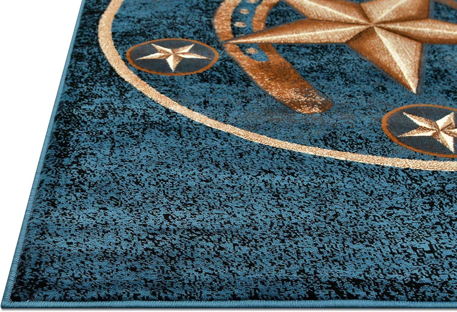 This magnificent area rug showcases the illustrious Texas Star, a timeless emblem of the Lone Star State's grandeur, set against a stunning denim-blue background. The star itself is crafted in a rich, textured bronze, evoking the rustic beauty of a well-worn pair of jeans, while its bold, linear accents and surrounding smaller stars shine with an antiqued patina. The denim backdrop is artfully distressed, resembling the beloved fabric in both color and spirit, ranging from deep indigo to lighter shades of blue. This creates a dynamic contrast with the bronze star, making the symbol stand out as the centerpiece of the design. Plush and inviting, the rug promises a soft underfoot experience, akin to slipping into your favorite pair of comfortable, well-fitted denim jeans. This rug is perfect for those seeking to infuse their space with a sense of Texan pride, coupled with the casual, laid-back vibe that denim brings.