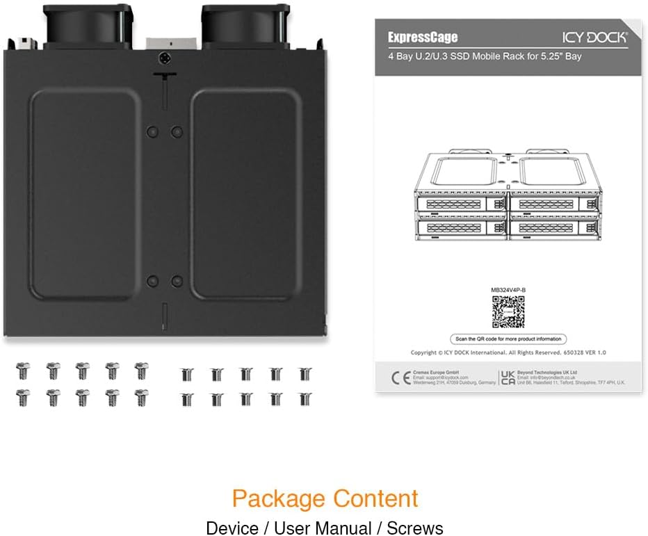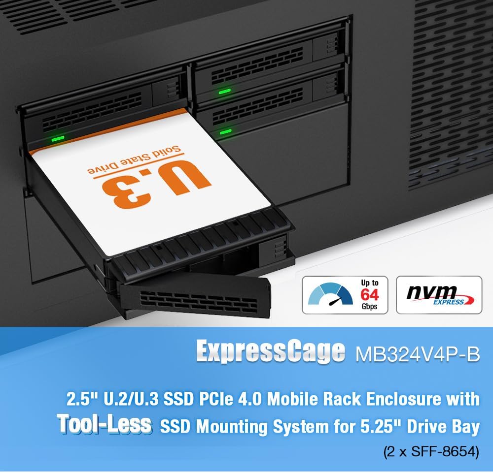 4 Bay 15mm U.2/U.3 SSD Mobile Rack for 5.25" Drive Bay - Tool-Less SSD Mounting System (2 x SlimSAS 8i SFF-8654),Enterprise-Grade Tool-less Tray Design Meets PCIe 4.0 Speed,The ICY DOCK ExpressCage MB324V4P-B is a high-performance mobile rack designed to house up to four PCIe 4.0 U.2/U.3 NVMe SSDs (up to 15mm height) within a single external 5.25" optical drive bay. Building on the ExpressCage series' renowned tool-less SSD mounting system, the MB324V4P-B combines fast drive swaps, secure SSD retention, and optional screw-lock support into one robust design. Unlike most tool-less systems that sacrifice mounting stability, ExpressCage's removable tray design with additional screw holes delivers both hot-swappable convenience and reliable SSD retention, earning trust from enterprise storage builders and performance enthusiasts alike.,Now upgraded for PCIe 4.0 bandwidth up to 64Gbps per SSD, dual 40mm cooling fans, and SlimSAS connectivity, the MB324V4P-B becomes a compelling next-gen storage platform for system integrators, edge computing deployments, AI workstations, and high-speed NVMe RAID builds.,High-Density NVMe Expansion in Any 5.25" Optical Drive Bay,The MB324V4P-B maximizes your chassis real estate by allowing you to install up to 4 x U.2/U.3 NVMe SSDs (up to 15mm height) into a single standard 5.25" CD/DVD drive bay. With support for the latest 61.44TB U.2 SSDs, this means you can build a 240TB+ high-speed NVMe storage array in just one drive bay.,This makes the MB324V4P-B ideal for applications such as:,Enhanced ExpressTray with Tool-less + Screw Mounting Options,The MB324V4P-B includes ICY DOCK's signature ExpressTray, which simplifies SSD installation with tool-less latching pins that securely hold your U.2/U.3 SSD in place without screws. Unlike typical tool-less designs that lack trays, the ExpressTray provides structural protection during drive swaps and can optionally be secured with screws for applications with frequent vibrations, mobile enclosures, or sensitive enterprise deployments.,Whether you're performing bench testing, configuring storage pools, or running your system in transit, the tray design ensures safe, quick, and repeatable SSD swaps every time.,Next-Gen Connectivity with SlimSAS & PCIe 8-Pin Power,The MB324V4P-B uses 2 x SlimSAS 8i (SFF-8654) connectors, each supporting two PCIe 4.0 U.2/U.3 SSDs at speeds up to 64Gbps per drive. SlimSAS is the preferred modern interface for high-performance NVMe backplanes and supports tri-mode HBA and RAID cards, offering exceptional bandwidth and reliability.,For power delivery, the MB324V4P-B utilizes a PCIe 8-Pin power connector-capable of supplying ample current to all four high-performance SSDs via a single cable, simplifying cable routing and improving airflow in dense systems.,Edge AI servers,Real-time data acquisition systems,High-density storage servers,Workstations with 5.25" bays requiring NVMe SSD support