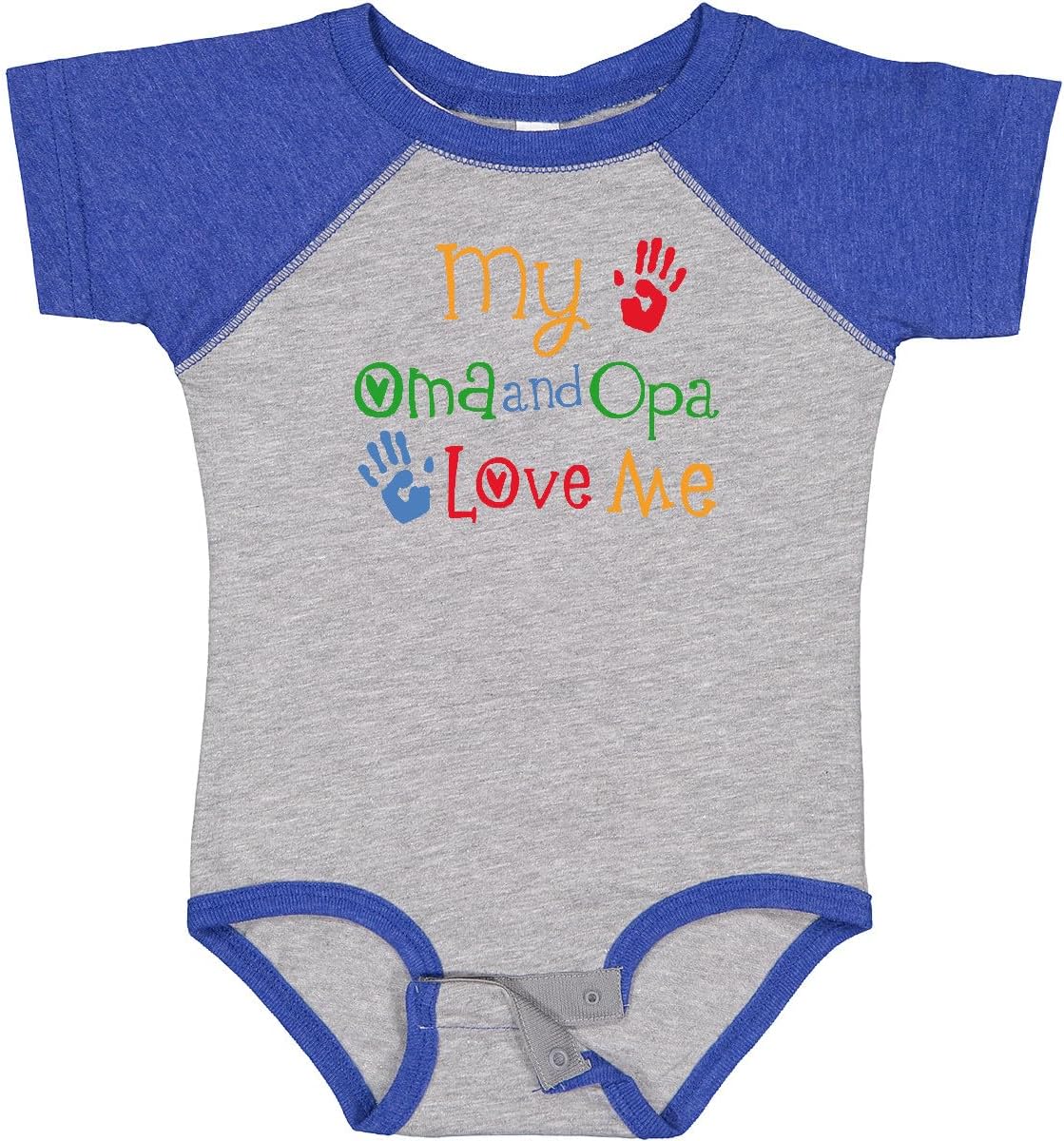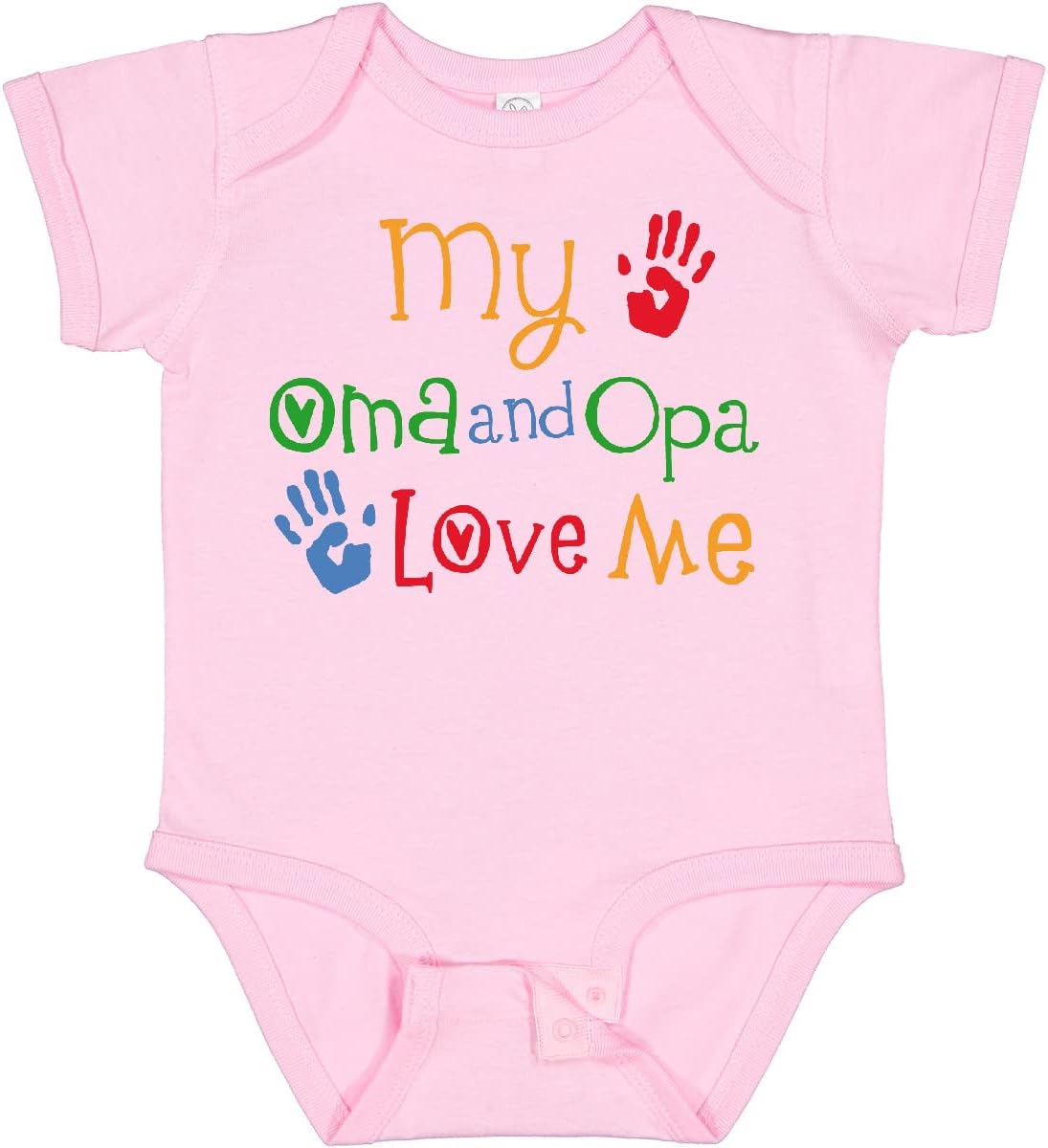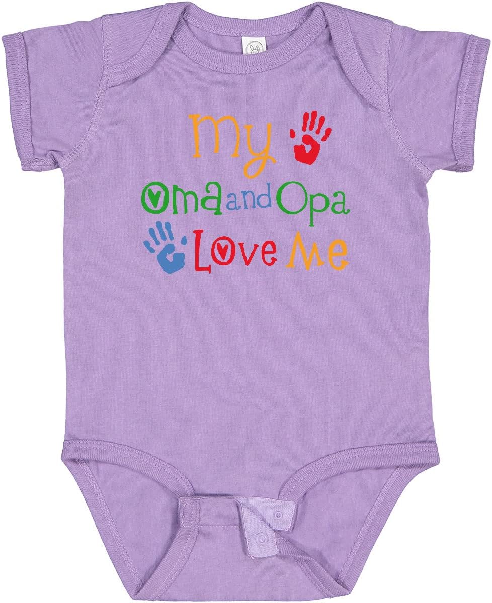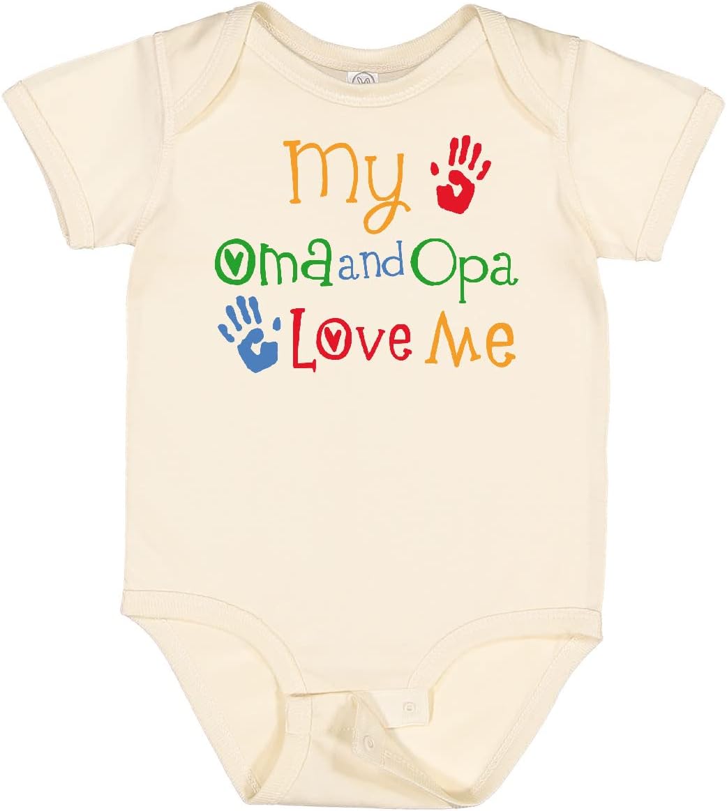 My Oma and Opa Love Me Baby Bodysuit gift for a grandson or granddaughter has colorful handprint design for boys or girls from their grandparents.