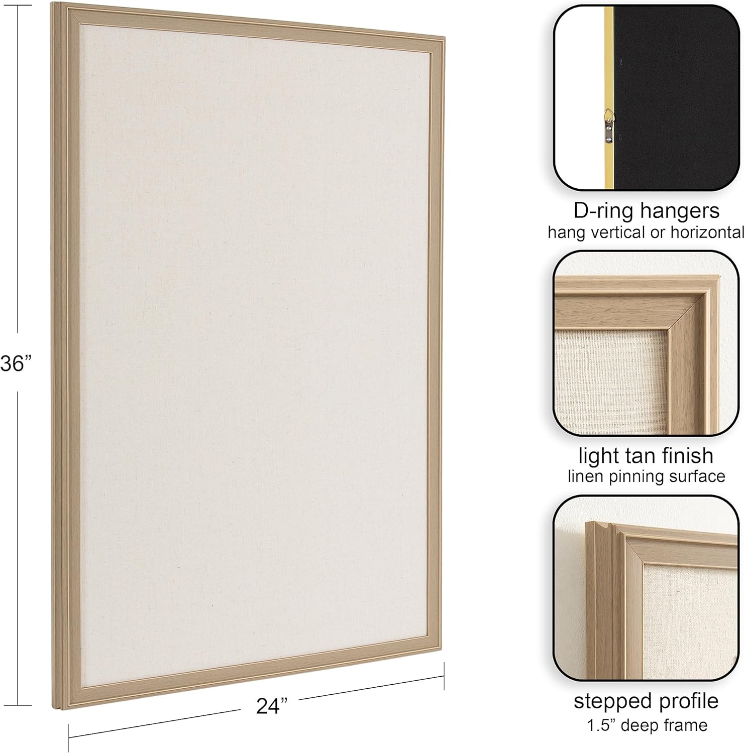 Introducing the Kate and Laurel Oakhurst fabric pinboard, the perfect combination of function and style for your home or office. The pinboard is made with a high-quality linen fabric that is durable and perfect for holding notes, photos, and other important documents. The classic stepped frame and lightly distressed finish add a touch of elegance and sophistication, making this pinboard perfect for vintage-inspired or traditional home decor. Use it to organize your to-do lists, keep important papers in one place, or create an aspirational vision board to help you achieve your goals. With the attached metal D-ring hangers, the Oakhurst bulletin board is easy to install on any wall in your home or office. The pinboard measures 24 inches wide by 36 inches high and features a tan frame that complements any decor style. Whether you're looking to organize your space or add a stylish touch to your decor, this pinboard is the perfect choice. Invest in this stylish pinboard today and take the first step towards a more organized and inspired life.