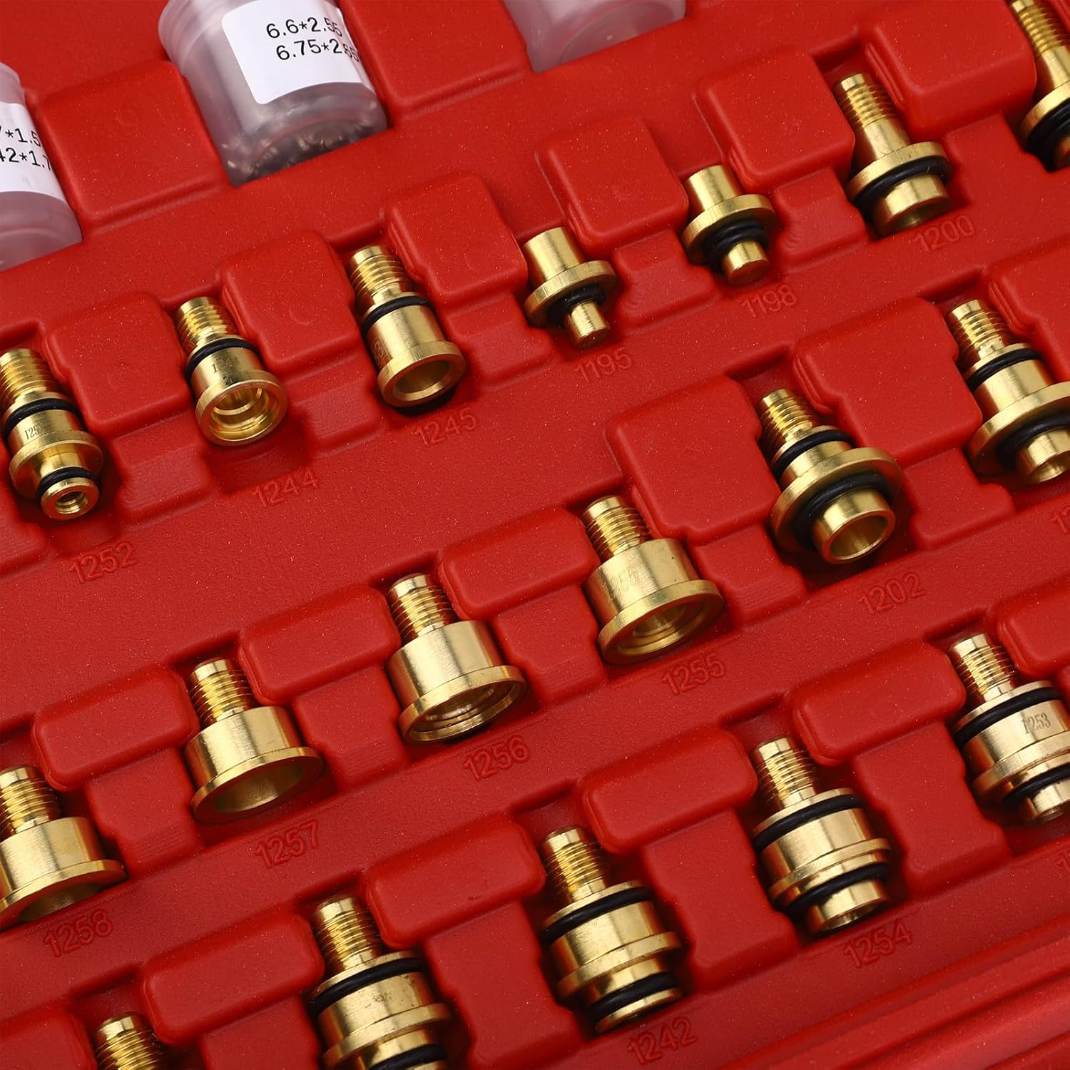 [Complete Repair Solution] Everything you need to identify and fix ac leaks in one convenient package. the comprehensive tool set simplifies the repair process from detection to completion. maintain optimal cooling performance and extend your vehicle's ac system lifespan with this solution. [Precise Leak Detection] This professional automotive air conditioning leak test kit delivers accurate results for both cars and trucks. the high sensitivity design quickly pinpoints even the smallest leaks in your ac system, saving you time and money on repairs. perfect for mechanics and diyers who demand reliable performance. [Premium Brass Construction] Crafted from high grade anti rust brass, these tools withstand frequent use without or wear. the durable material ensures long lasting performance through repeated testing cycles. you can trust this kit to remain reliable season after season. [Portable Storage ] Includes a rugged blow molded that keeps all components organized and protected. the compact design makes it easy to transport your tools to any job site or store them neatly in your garage. always have your complete leak testing kit ready when you need it. [User Friendly Design] Engineered for effortless operation by both professionals and home mechanics. the intuitive design requires no special training to achieve professional grade results. quickly master leak detection with this straightforward yet powerful tool set. Spec: Item Type: Automotive Air Conditioning Leak Test Kit Material: Brass Fitment: Fit for Car Truck Auto AC ( only applicable to Asian such as Korean and Japanese ones) Package List: 1 x AC Leak Test Kit (121 pcs) 6 x Storage Box 1 x Blow Molded Box
