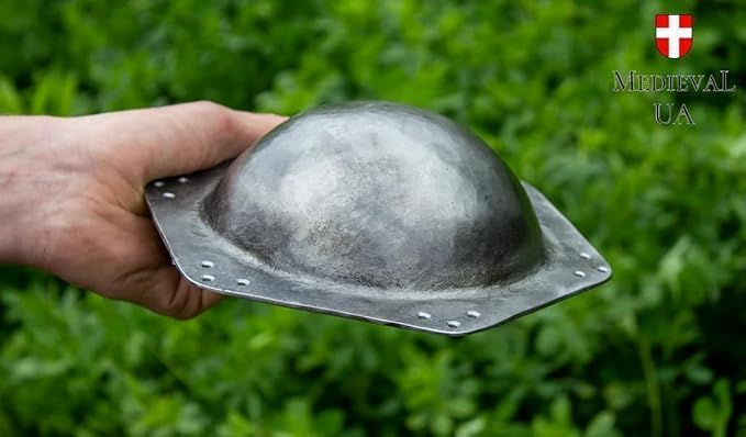 Step back in time with this authentically designed medieval shield boss, crafted to bring historical accuracy to your battle reenactments and theatrical productions. The traditional round umbo design features a distinctive dome shape mounted on an octagonal base, complete with an intricate decorative border pattern that adds both visual appeal and structural integrity. Constructed from robust 18-gauge steel, this shield boss delivers reliable durability while maintaining period-appropriate aesthetics. Measuring 8.5 inches wide by 8.0 inches long, with a 3.5-inch height, this center-mounted boss is perfectly proportioned for standard shield configurations. The steel gray finish complements its classic design, while the ambidextrous orientation ensures versatile use. Each boss comes carefully packaged in a protective box to maintain its pristine condition. Simple maintenance requires only occasional wiping with a dry cloth to preserve its appearance. Whether you're a dedicated reenactor, theater prop master, or medieval history enthusiast, this shield boss provides the authentic touch needed for your historical representations.