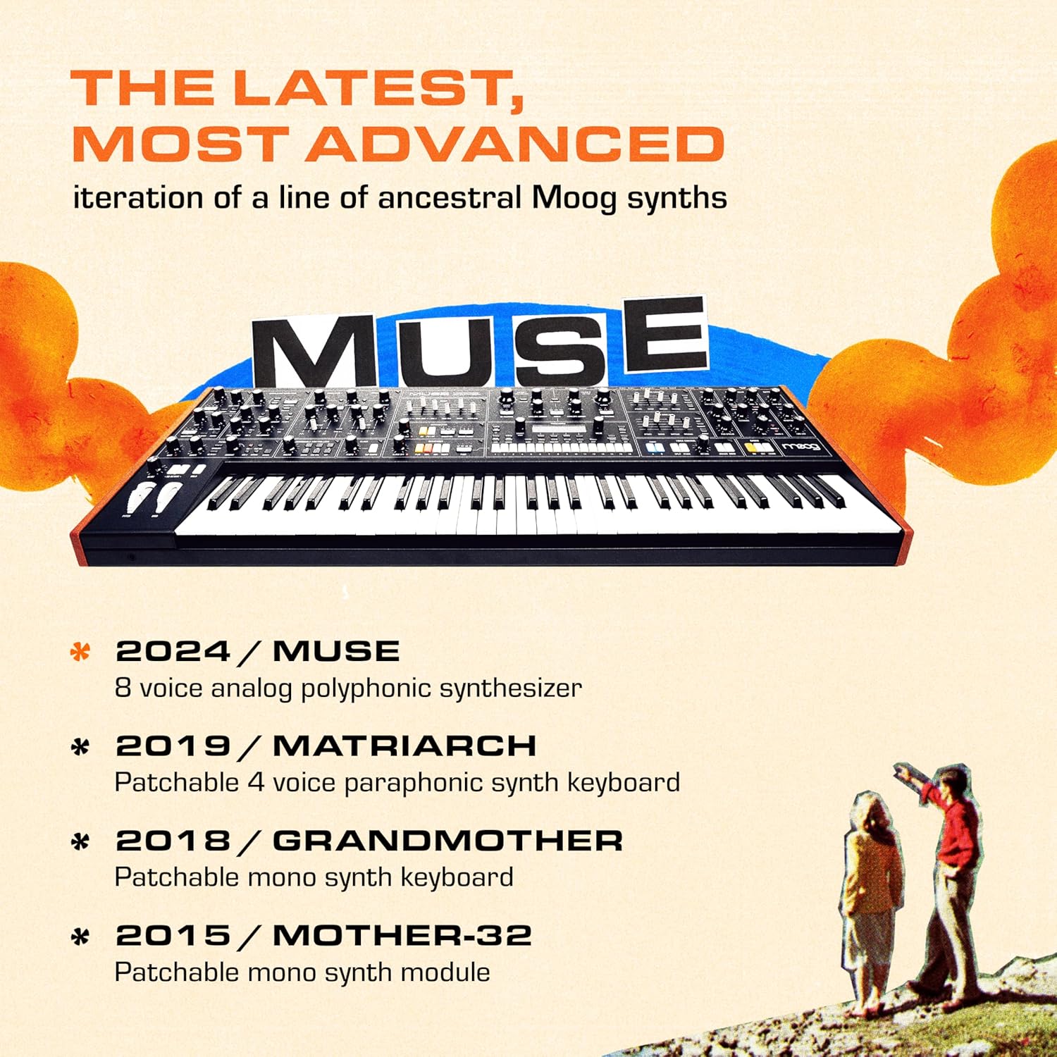Muse is an eight-voice analog bi-timbral polyphonic synthesizer - the culmination of over 5 years of dreams, design, and passion. Muse is an intuitive and powerful instrument built on the rich history of MOOG that simultaneously gazes boldly into the future.Best of the BestA melting pot of classic MOOG analog circuit designs is paired with forward-thinking digital controls in one complete instrument. Muse combines discrete oscillators derived from the MiniMOOG Voyager, brought together by a saturating mixer, dual transistor ladder filters, and stereo discrete VCAs all inspired by MOOG Modular circuits.Stage to StudioWith performance-oriented controls, an intuitive knob-per-function layout, and "More" menus for every module, Muse was created for, and by, modern musicians, producers, and sound designers. In addition to Muse’s creative immediacy, a powerful arpeggiator, chord memory, and a polyphonic sequencer provide deep editing capabilities and generative behaviors that fuel musical expeditions.MesmerizingA hypnotic stereo Diffusion Delay processor was inspired by golden era vintage digital rack delays with a unique and powerful set of diffusion, multi-tap, and filter behaviors. Craft complex echoes and diffused tonal smears that add dimension and depth to any patch.