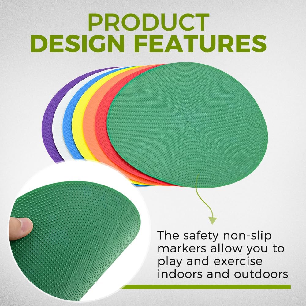 Features: 1. Material: Made of thermoplastic elastomer (TPE) material with a tear-proof design, the spot floor dots are soft and durable, suitable for indoor and outdoor surfaces, and is not easy to damage.2. Anti-Slip Floor Spot Markers: Each poly spots have an anti-slip silica gel bottom that ensures stability on any surface and prevents sliding or movement.3. Multiple Colors: These rubber spot markers come in seven colors to meet different occasions and needs. They are bright in color and have high visibility. Bright colors improve visual acuity, making it the perfect device for training exercises or game areas.4. Easy To Use: With a collect bag you can easily carry cones at once, it can save your time and space when storing, it is simple and convenient to use and easy to clean.5. Wide Application: These agility training equipment can useful for sports in gym class or agility drills, such as football,basketball,baseball,dances and other practice training. Our spots markers are the first choice for indoor and outdoor activities and can be used for agility training, helping athletes improve speed and flexibility, and enhance the effectiveness of games or training.Package include: 14 x Spot Markers Dots(7 colors, each of two)1 x Portable Storage