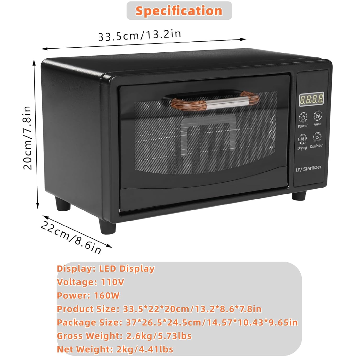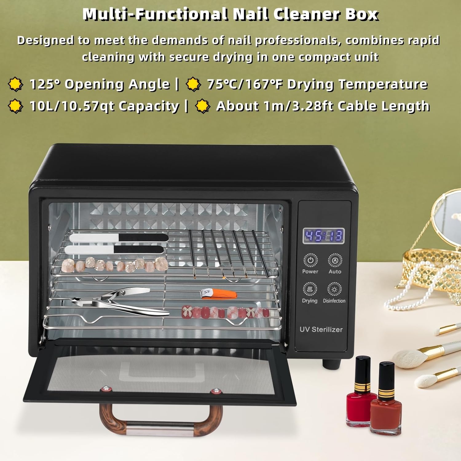 Specification: Material: Galvanized Sheet, 201 Stainless Steel, Tempered Glass๐๐จ๐ฅ๐จ๐ซ: ๐๐ฅ๐ฎ๐/๐๐ฅ๐๐๐ค/๐๐ข๐ง๐ค(๐๐จ๐ฅ๐จ๐ซ ๐ข๐ฌ ๐๐ฉ๐ญ๐ข๐จ๐ง๐๐ฅ)Process: High-temperature Baking Paint Assembly Required: NoMounting Type: TabletopDisplay: LED DisplayPlug Type: US StandardVoltage: 110VPower: 160WOpening Angle: 125ยฐDrying Temperature: 75โ/167โCapacity: 10L/10.57qtPower Cable Length: About 1m/3.28ftProduct Size: 33.5*22*20cm/13.2*8.6*7.8inPackage Size: 37*26.5*24.5cm/14.57*10.43*9.65inGross Weight: 2.6kg/5.73lbsNet Weight: 2kg/4.41lbsPackage Included: 1* Nail Care Tools Drying Box1* English Manual๐๐จ๐ญ๐๐ฌ:1.Please read the operating manual completely before use. And pay particular attention to the safety instructions included.2.Please do not open the door frequently during work to avoid affecting the effect.3.It is prohibited to put water or foreign objects into the air vent to avoid danger.4.It is prohibited for children to use. Please keep it away.5.Please allow the slight color difference caused by the shooting light and 1-3cm error due to manual measurement, and make sure you do not mind before ordering.