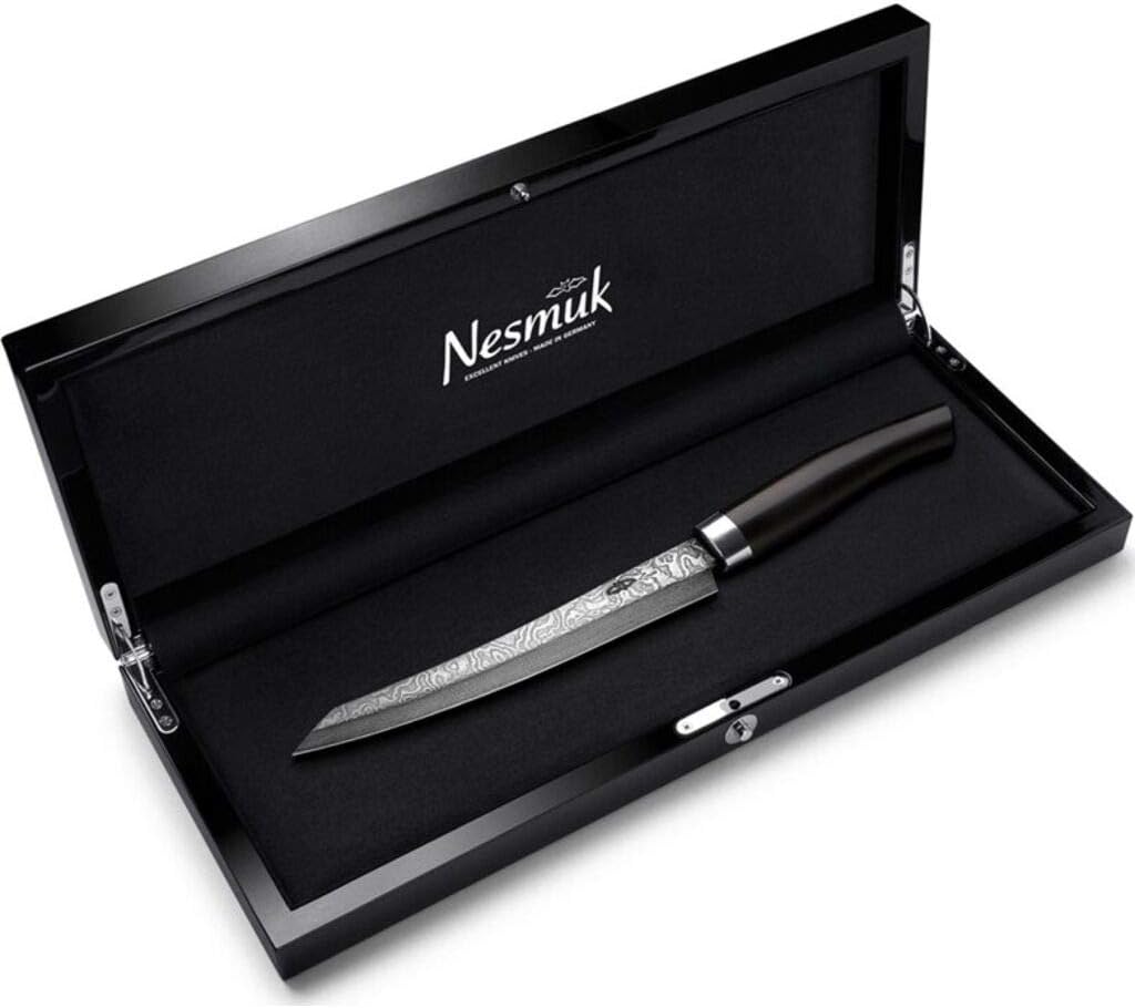 Precision Tool By A Masterly Hand210 layers of steel form the elegant pattern of the wild damascus steel and underline the elegant form of the slicer. The 160mm blade with hollow grind on both sides is ideal for filleting. Carbon content: 1%. The exclusive coating technology Nesmuk Protective Coating (NPC) reduces the usually needed maintenance.Form And FunctionThe shape of the blade is ground by hand and was developed for minimal adherence and comfortable working.Filleting On The Highest LevelOnly the combination of the finest carbon steels, flexible blade, and a hollow grind on both sides allow for precise filleting on the highest level.Specifications:Blade: 160 mm, hand-forged damascus steel with cutting layer, 210 layers, 62 63 HRC, both sided hollow grind, NPC CoatingClamp: High-gloss polished stainless steelIncluded: Nesmuk leather sheath, Piano-lacquer box, certificate of authenticityModel: EVDBR1602012, EVDC1602011, EVDEM1602014, EVDG1602011, EVDJ1602011, EVDJI1602012, EVDME1602012, EVDMB1602011, EVDMG1602012, EVDZE160