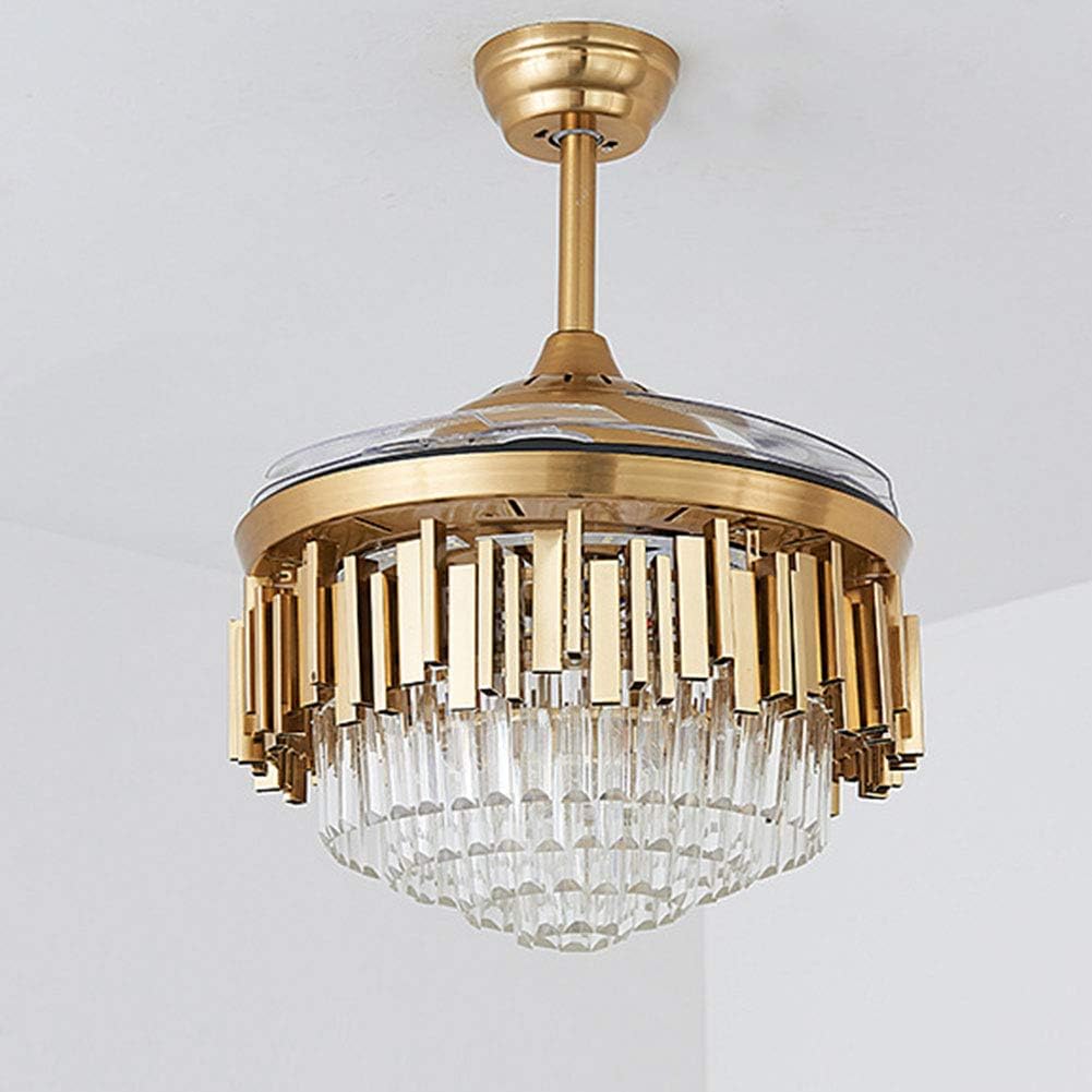 42"Crystal Ceiling Fan Chandelier, Invisible 4-Blade Automatic Expansion Design Chandelier, Remote Control 3 Color Lights and 3 Wind Speed Fan Pendant Lights Features:★As for a ceiling fan, it has 4 retractable blades that can stretch out and put inside automatically when turned on and off.★That means, when turned off, the blades will put inside and become 'invisible', totally a chandelier with crystal;★When turned on, the blades will stretch out, and transfer to a traditional ceiling fan with lights.★This chandelier fan is controlled by remote control, ceiling fan speed and LED light can be controlled separately by a single remote control.Fan Chandelier:Pendant Lights Type: Crystal Pendant LightsMaterial: Stainless Steel+k9 crystal+ABS fanSize: 42 inchesColor: Gold/Rose GoldStyle: modernNumber of Blades: 4Lighting Features: dimmable, fan lightApplication Type: IndoorLight Bulb Type: LEDNumber of lamps: 10Power: 41W (inclusive) -50W (including)Applicable Places: living room/bedroom/kitchen/office and restaurantVoltage: 110VPlease Note:The actual color of the chandelier may be deviated due to the color of the display and the angle of the picture.Please receive the actual color of the goods as standard, thank you for your understanding and support.