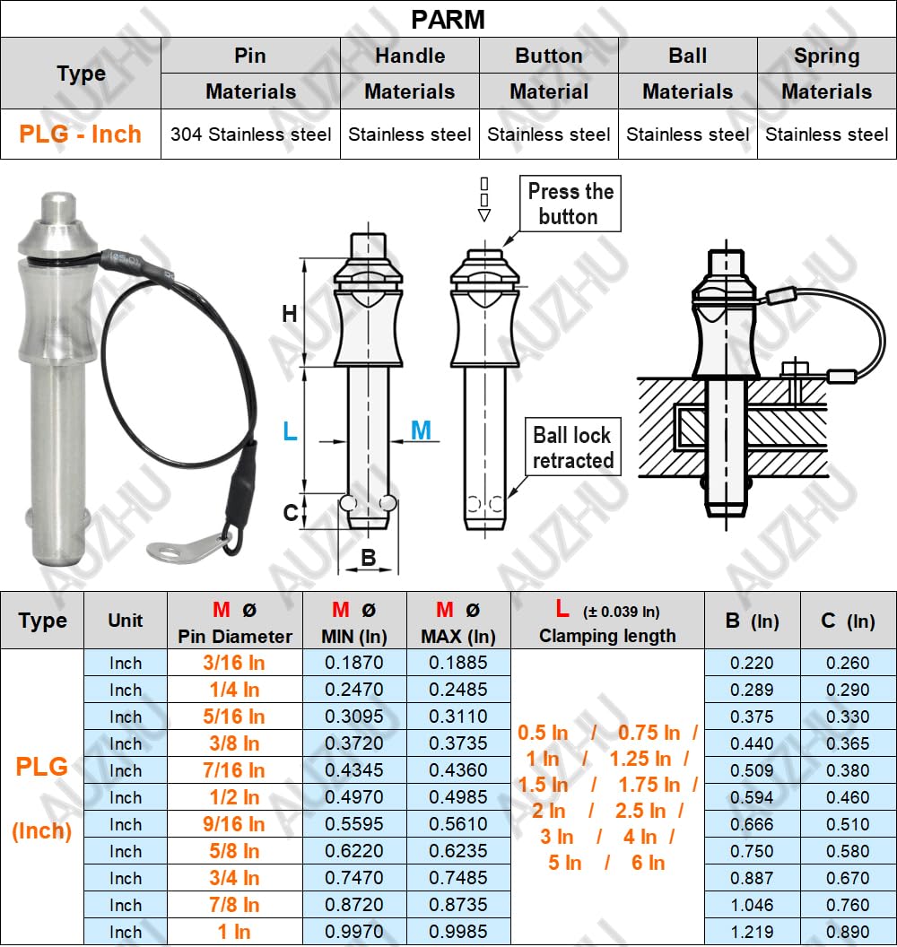 About this product: * This quick release pin is locked by two raised ball locks. When in use, the installation or removal of the pin can be easily controlled by simply pressing the button, and the operation is simple and convenient. The quick release pins are made of high quality 304 stainless steel, this high quality stainless steel metal material can be widely used in complex environments such as food industry, high humidity environment or outdoor. It is a high-quality positioning pin with high precision, safety and environmental protection. * Scope of application: This quick release pin is made of high-quality stainless steel, which is strong, wear-resistant and corrosion-resistant. It can be widely used in standard parts of precision equipment such as factory automation, MRO, manufacturing and processing, electronic and electrical equipment, ships, military aviation, decorative hardware, industrial manufacturing, plastic molds, etc. * Quick Release Pins are ideal for quick fixation components, in particular when they are continuously removed and repositioned. This quick release pin is available in a variety of sizes to meet customer requirements for different sizes. It can be used with an anti-lost rope to be safer, traceable, and prevent loss. * We are a factory, if you need more special hardware parts, we can provide customized processing services. We can customize the style and size you need according to the customer's drawings or requirements, and welcome your letters.