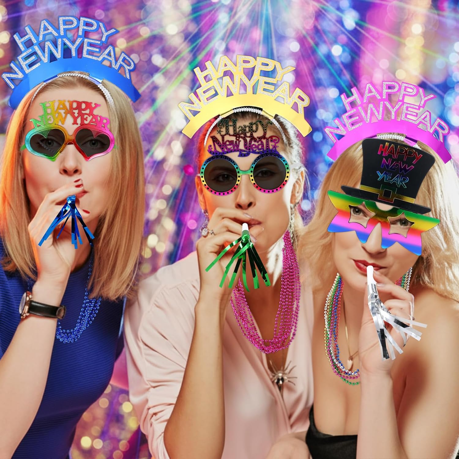 Feature: One size fits all: These New Year's items come in one size fits all and are designed to fit adults and fit most face shapes, making you stand out from the crowd. Essentials for party photography: 2026 New Year's Eve party decorations are cute and exquisite, you can also use them as photo props to take meaningful photos of your family and partners. Specifications: Material: Hairband: aluminum foil and cardboard Glasses, necklace, noise makers: plastic Color: Glasses: rainbow color Hairband: gold, silver, rose, blue, red, green Noise makers: gold, silver, rose, blue, red, green Necklace: gold, silver, rose, blue, red, green Size: Glasses: about 15 x 12 cm/ 5.9 x 4.7 inch Headbands: about 7 x 4 inches/ 18 x 11 cm Noise makers: about 6.7 inches/ 17 cm long Necklaces: about 31.5 inches/ 80 cm in circumference Package includes 48 x New Year headbands 48 x New Year glasses 48 x New Year bead necklace 48 x New Year noise makers Warm reminder: Manual measurement, please allow slight errors on size. The color may exist a slight difference due to different screen displays. Suitable for people over 15 years old. Pointed items are included,please be careful when using and please keep them away from under 15 years old. Winding risk may exist, please keep our product away from under 15 years old