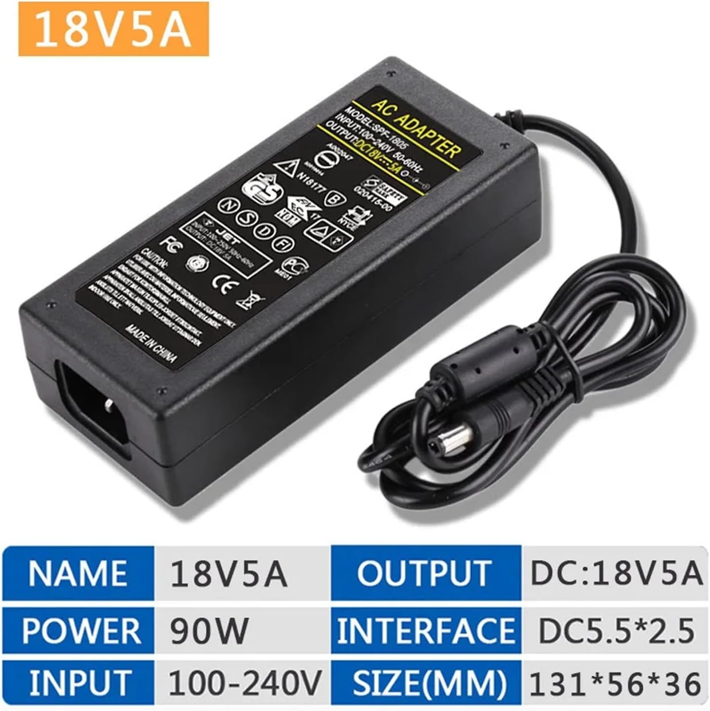 Power AdaptersPower Adapter, AC 100-240V to DC 18V5A Switching Transformer Jack 5.5mm X 2.5mm