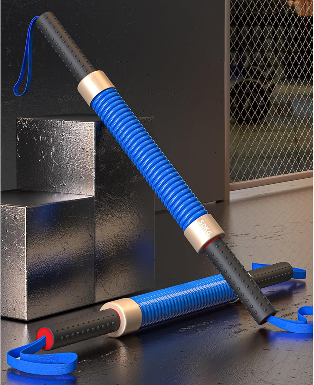 Power Twister Bar, , with good rebound stability, Very suitable for home and gym, used for chest, back, arms and biceps exercise COLOR: Blue MATERIAL: metal spring + ABS handle + Braided rope SPECIFICATIONS: 30kg, 40 kg, 45 kg, 50 kg, 60 kg, 80 kg, 100 kg MULTI-PURPOSE: For Shoulder, Forearm, Bicep, chest, arm, back, PACKAGE CONTENTS: Power Twister Bar x1, storage bag x1