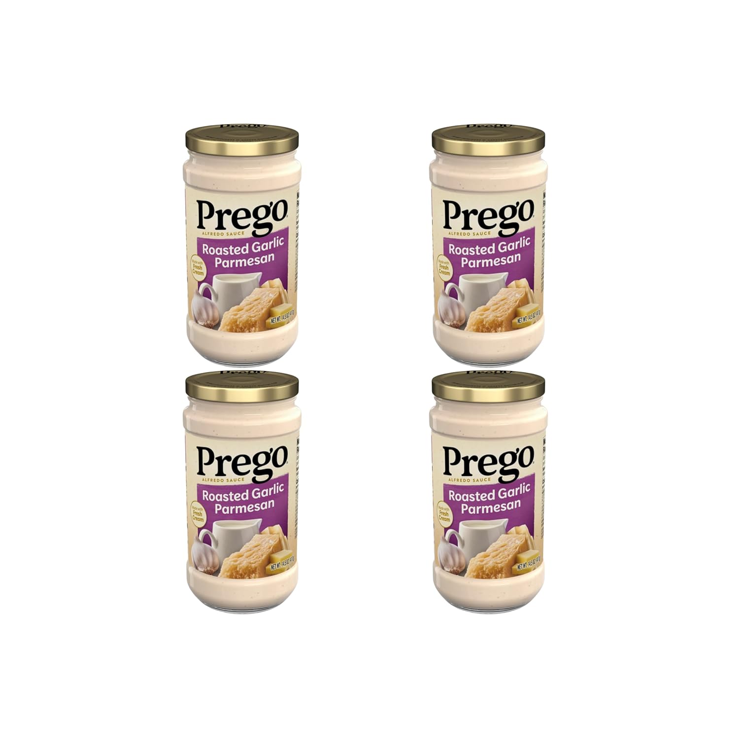 Be the hero at dinner with Prego Alfredo Pasta Sauce with Roasted Garlic and Parmesan Cheese. Versatile and delicious, this classic cream sauce features tangy flavor of parmesan cheese and a touch of roasted garlic for a taste the whole family will enjoy. This pasta sauce has a taste everyone loves and a thick texture that doesn’t water out, making it the perfect choice for fettuccine alfredo or our simple Shrimp Alfredo. This Prego pasta sauce is made with fresh cream and no high fructose corn syrup for an alfredo pasta sauce you can feel good about. Top off any pasta with Prego sauce for a quick, family-pleasing meal, or use it as a base for your favorite recipes. The white sauce jar top is easy to close and store in the refrigerator for leftovers. Give your family the taste everyone loves with Prego.