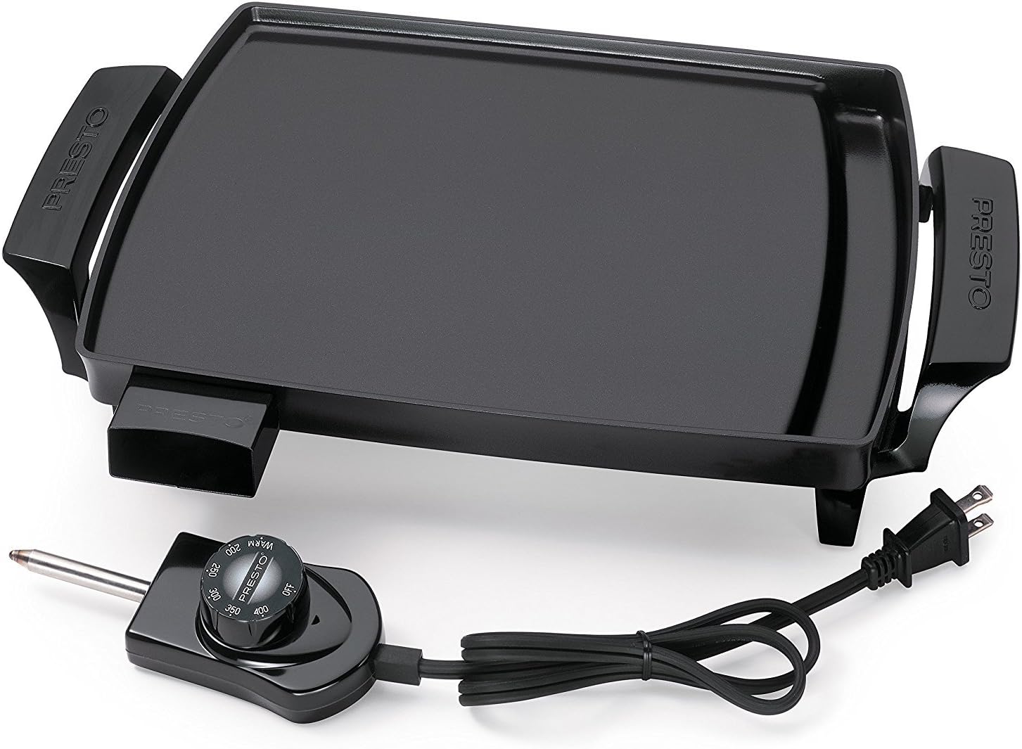 Enjoy quick and convenient cooking with the PRESTO Limited Edition small electric griddle, designed for compact kitchens, RVs, or anyone seeking a portable griddle solution. This mini electric griddle features a durable cast aluminum body and a slightly textured nonstick surface, making it easy to cook healthier meals with minimal oil. The 8.5 x 10.5 in. flat griddle surface is ideal for preparing up to four eggs or two steaks at once, while the built-in grease tray channels away drippings for easy cleanup. With 1,000 W of power and adjustable temperature control, this electric griddle maintains precise heat from warm to 400°F, ensuring perfect results for pancakes, bacon, or grilled sandwiches. The removable heat control allows the unit to be fully submersible for effortless cleaning. Its compact, foldable design with detachable leg-handle units makes storage simple, even in small spaces. Backed by a limited warranty, this portable griddle is perfect for everyday use or travel, offering reliable performance and easy maintenance. No batteries required. Includes tongs.