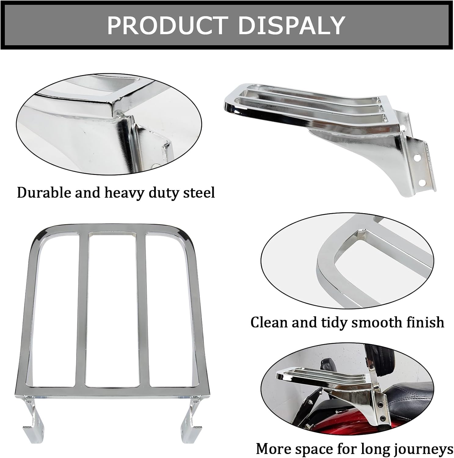 Fitment Our solo seat rear luggage rack carrier for sportsters fits for Sportster XL 883 1200 2004-up (except XL1200CX Roadster) equipped with detachable sideplates Dyna 2006-2017 (except Fat Bob FXDF FXDFSE and 2010-2017 Wide Glide FXDWG) equipped with detachable sideplates Softail 1984-2005 (except Deluxe FLSTN and Deuce FXSTD) equipped with detachable sideplates FLST, FLSTC and FLSTSC 2006-2017 equipped with detachable sideplates FLSTF 2006 equipped with detachable sideplates Specifications Condition:100% Brand new aftermarket item Material: steel Color:As pictures shown Package contains 1 x Motorcycle Luggage Rack Notes 1.We strongly suggest comparing the posted picture to your faulty/old unit!Please kindly check your motorcycle's model and confirm this item is suitable for it before ordering. 2.The product does not contain installation instructions. If you have any questions about that, we kindly recommend you go to the nearby mechanic to ask for professional instructions. 3.Installation:Easy to install,assemble and remove with great convenience,direct replacement.Highly recommended installation by professional. 4.Color Difference: Due to the light and resolutions setting difference, the item's color may be slightly different from the pictures. 5.Please allow slight dimension difference due to different manual measurement.