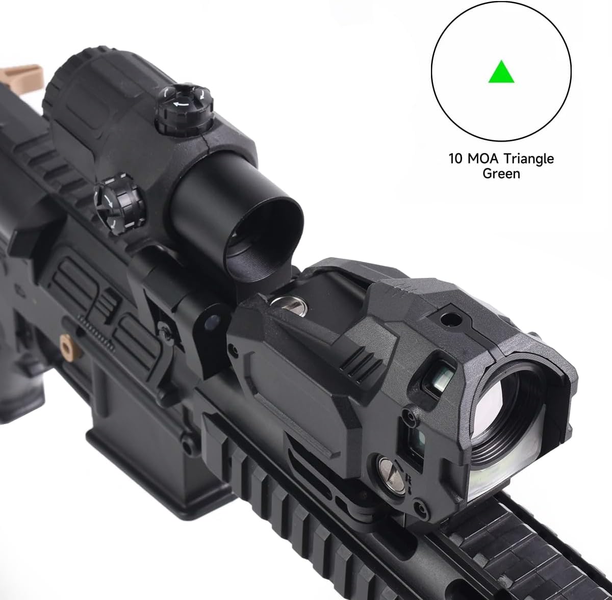 Specifications Reticle: 10 MOA Triangle for fast target acquisition Material: 6063 aluminum CNC main body + engineering polymer housing Fiber Option: Red / Green fiber Brightness: 5 auxiliary brightness levels Glass: Multilayer-coated laminated glass Mount Type: 20mm mount Dimensions: 96 × 55 × 66mm Weight: 211g Functions: Fiber-assisted illumination、ambient-light responsive brightness、30-minute auto shut-off、magnifier compatible