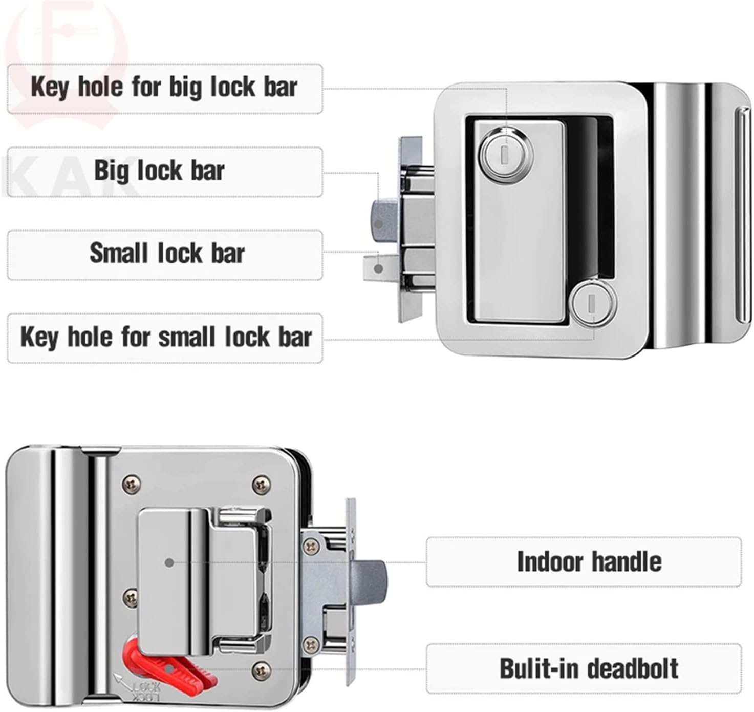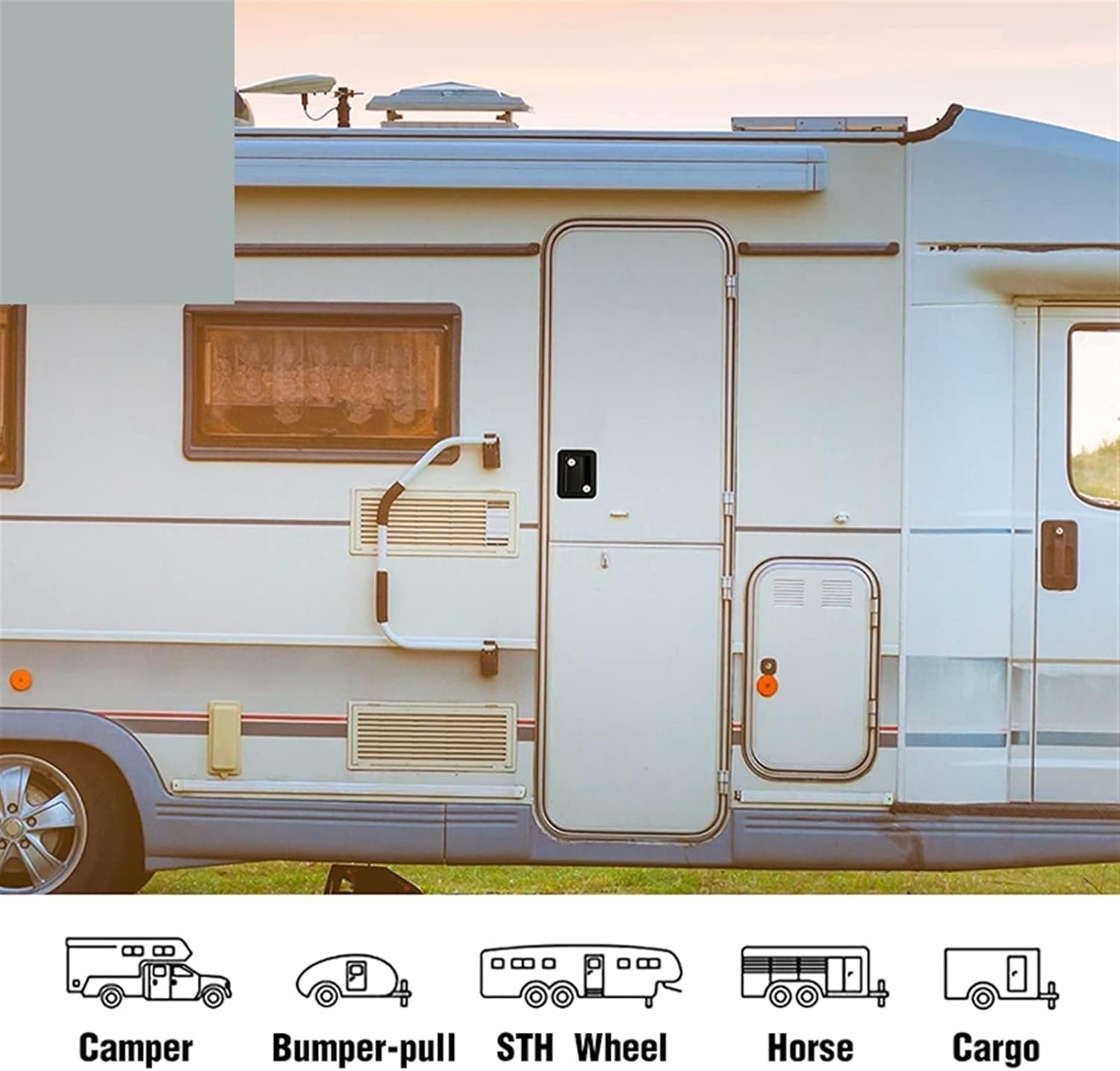 Gate LocksSecurity RV Door LockWhether you're getting ready to go on a hike, a bicycle ride, or for a quick trip to the nearby town, RV trailer door lock, featuring a deadbolt, will add adequate protection for your little RV home .Upgraded computer keysThe built-in deadbolt fully secures an RV door, making it very difficult for thieves to gain entry.3 Color ChoicesThere are white, black, chrome color choices, you will find the perfect one for your RV door.ParametersMaterial: Zinc AlloyColor: Black/White/ChromeCut Hole: 68x92mmDoor Thickness: 32-38mm Package includes: 1 x lock with accessoriesUpgraded Version: Cheaper same type lock from other stores is with normal keys, but our RV door lock is with upgraded computer key,More Details Real ShotAll zinc alloy base plate, more durable and more stable.Versatile Door LockFits most RV doors (hole cutout is 2.67'' x 3.6'' and door thickness from 1.25" to 1.5"). It can be widely applied in travel trailers, campers, trucks, horse trailers, cargo haulers, etc., practical for protecting the contents in cars.With built-in deadboltInside and outside double open and double lock.Complete PackageEasy InstallationThe installation process is easy because it comes with the necessary hardware:the lock handle, strike plates,and all size of screws.